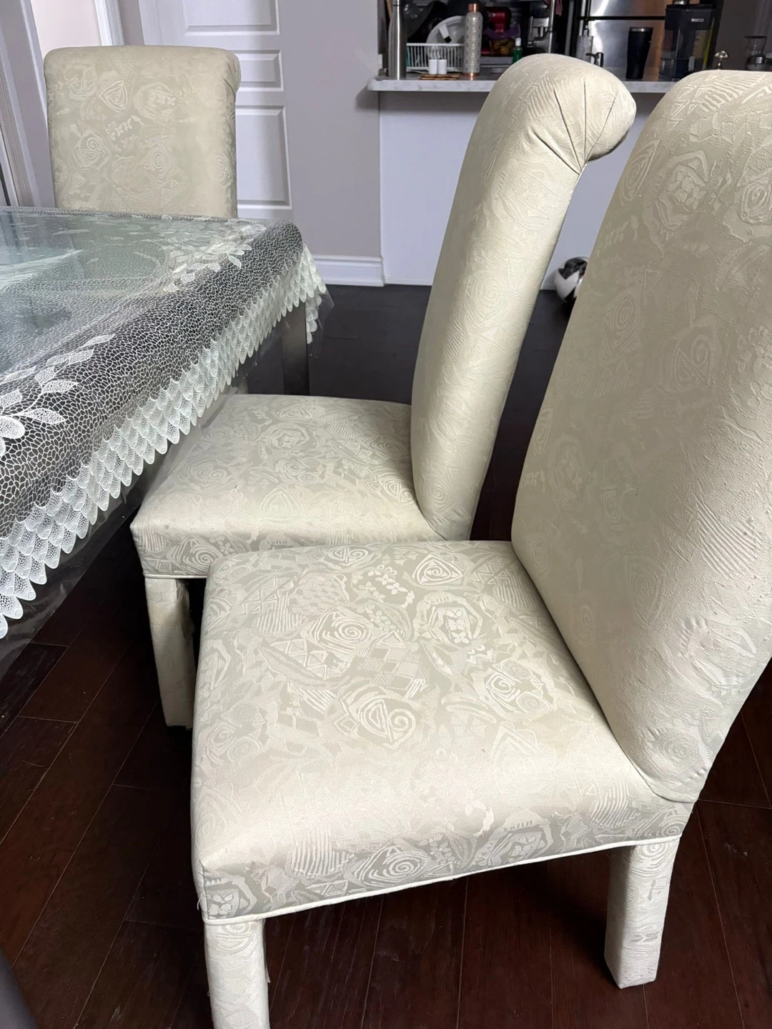 Six dining chairs with a floral jacquard pattern. They're upholstered and come with sturdy legs. These chairs add a touch of elegance to any dining space. 40 each . ( can do 200 for 6)