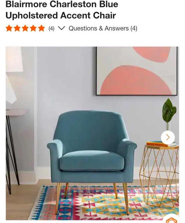 This stylish Blairmore Charleston blue upholstered accent chair features a sleek design with gold-toned legs, offering a modern touch to any living space. Brand new, still sealed in the original packaging. Looking to add a pop of colour to your reading nook? This chair is not just a seat, it's a statement! If the ad's up, the chair's available!