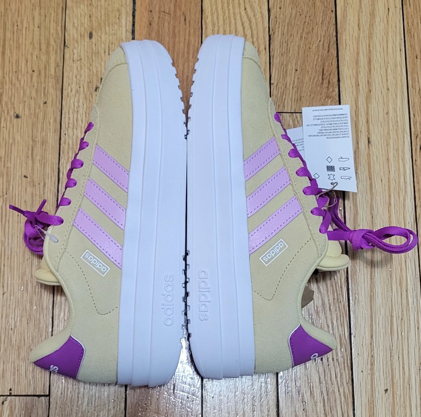Adidas VL Court Bold J platform sneakers in a tan and purple colorway. Features a suede upper and platform sole. Size US 4.5 (UK 4, FR 36.5, JP 230, CHN 225).