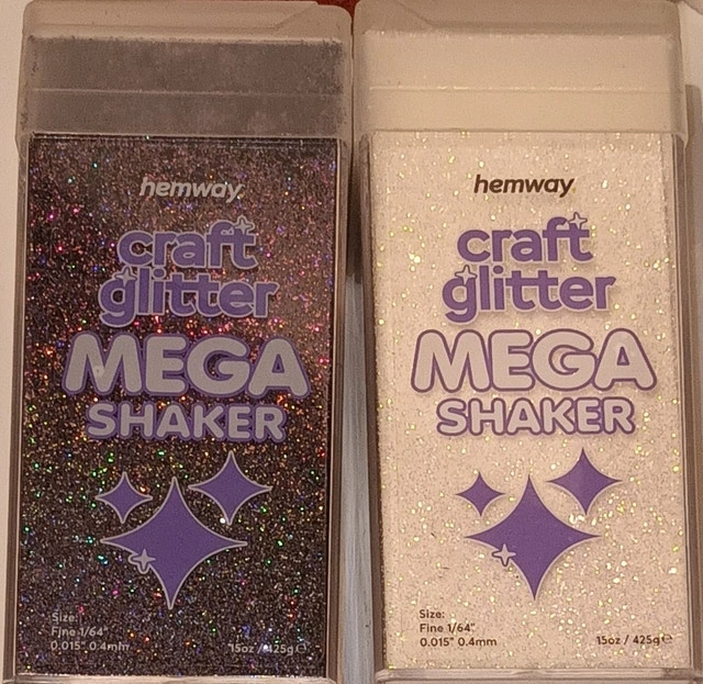 Selling two NEW sealed boxes of Hemway Premium Craft Glitter in Black & Mother of Pearl. Each shaker is 425g, fine glitter. Great for resin, epoxy, crafts, jewelry, tumblers, and decorations. This is a durable, waterproof, and fade-resistant glitter that adds a beautiful shimmer. The dual-opening lid makes it easy to use. Hemway is a quality British brand. Smoke-free home. Message to arrange a pick up in Summerside.