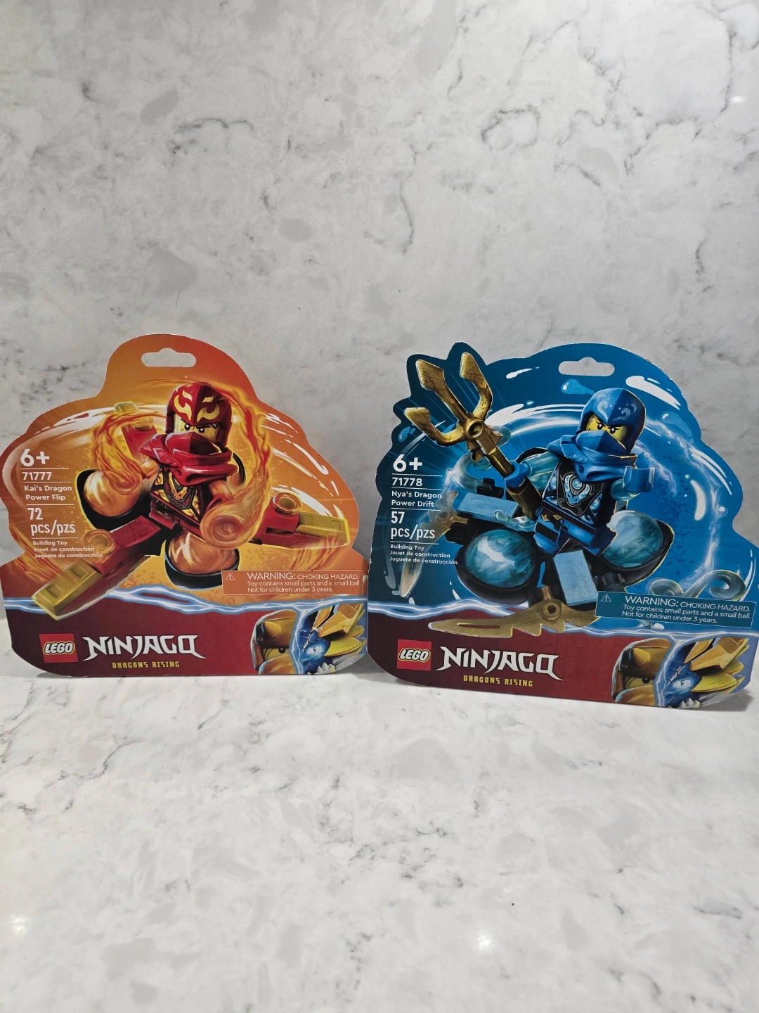 I have two brand new LEGO Ninjago sets for sale! These are from the Dragons Rising series. One is Kai's Dragon Power Flip (71777) with 72 pieces, and the other is Nya's Dragon Power Drift (71778) with 57 pieces.