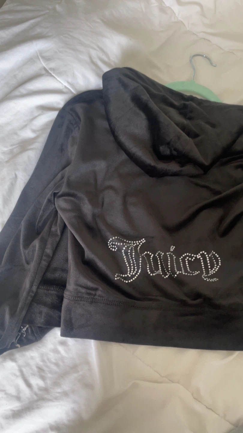 This is a black velour hoodie by Juicy Couture. It features rhinestone embellishments on the back. Zipper closure.