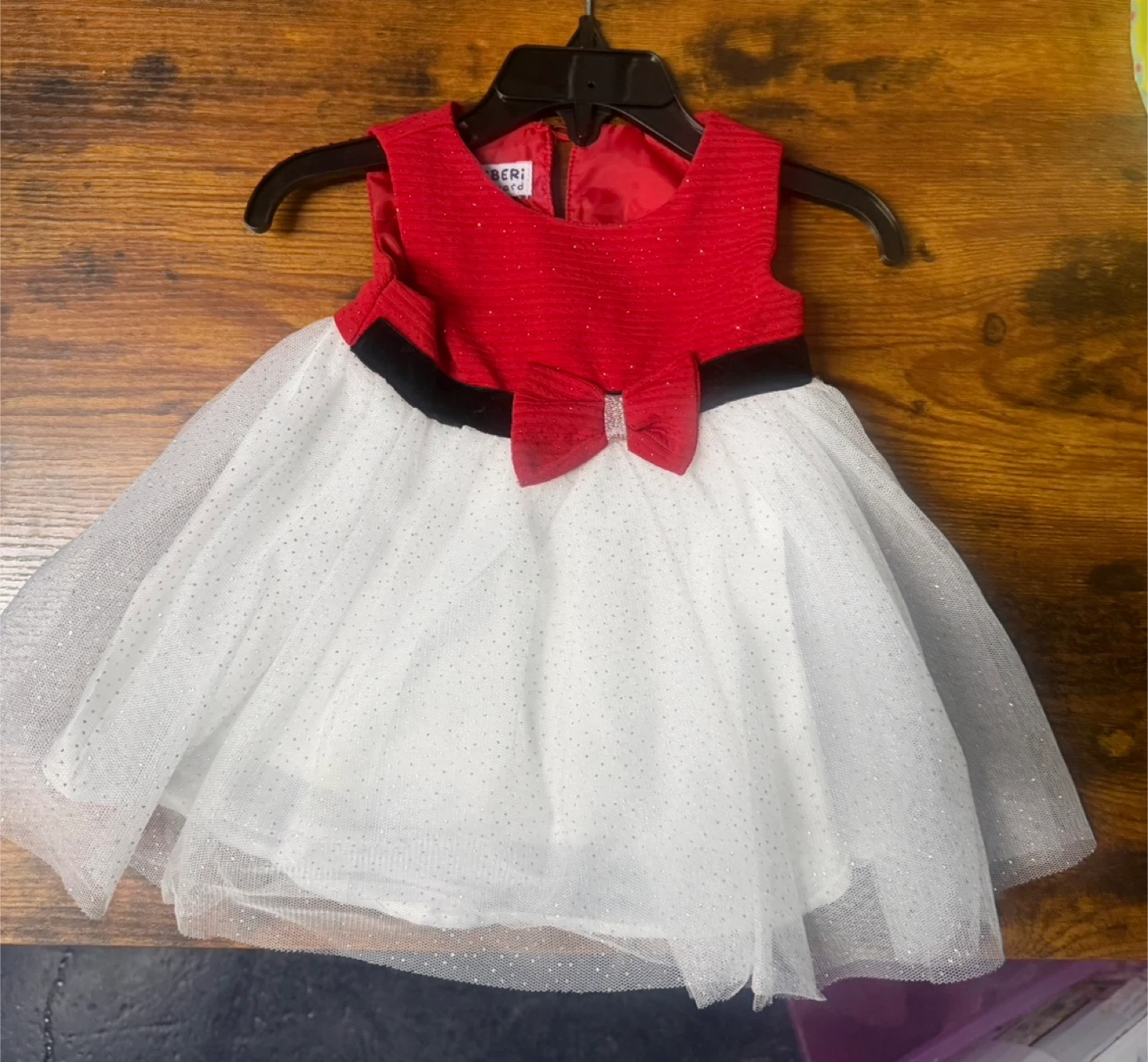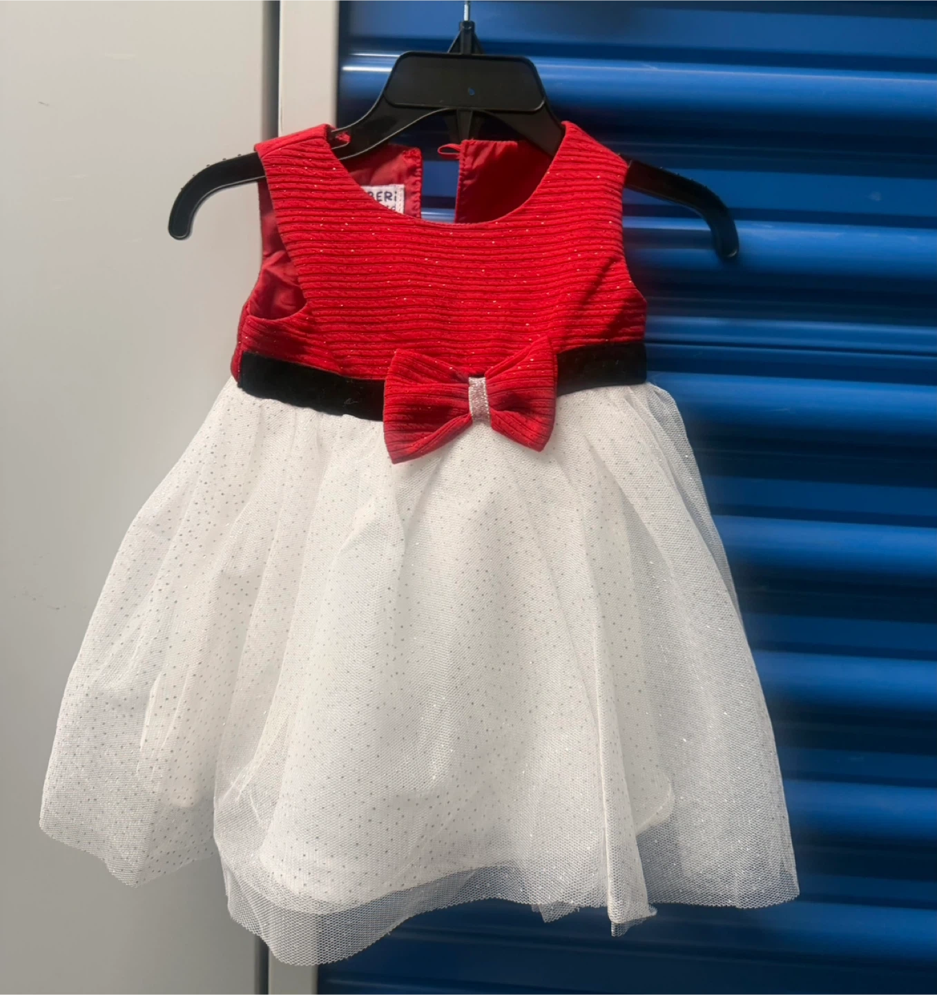 This adorable baby girl dress comes with a matching festive coat. The dress features a sparkly white tulle skirt and a red glittery bodice with a bow. The coat is red with white faux fur trim. Perfect for holiday parties!
