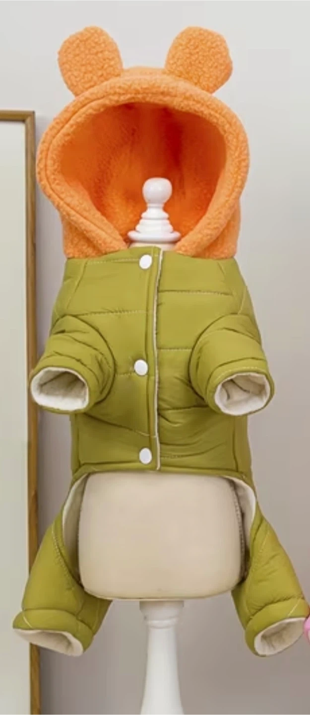 This dog winter coat is a cozy green color with a fuzzy orange hood featuring bear ears. It has a soft, sherpa-like lining for warmth. The front closure has white snap buttons. It's a full-body suit with padded sleeves and legs.