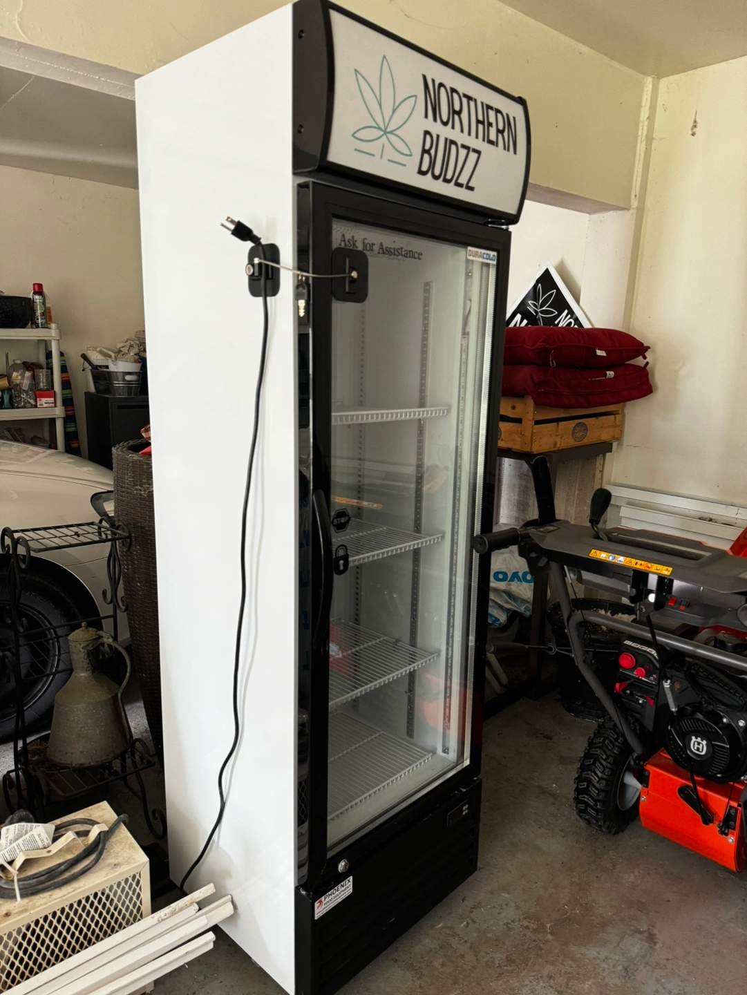 Drink fridge with lights, locks, on locking wheels, good condition! Paid $1200 for it. Works perfectly