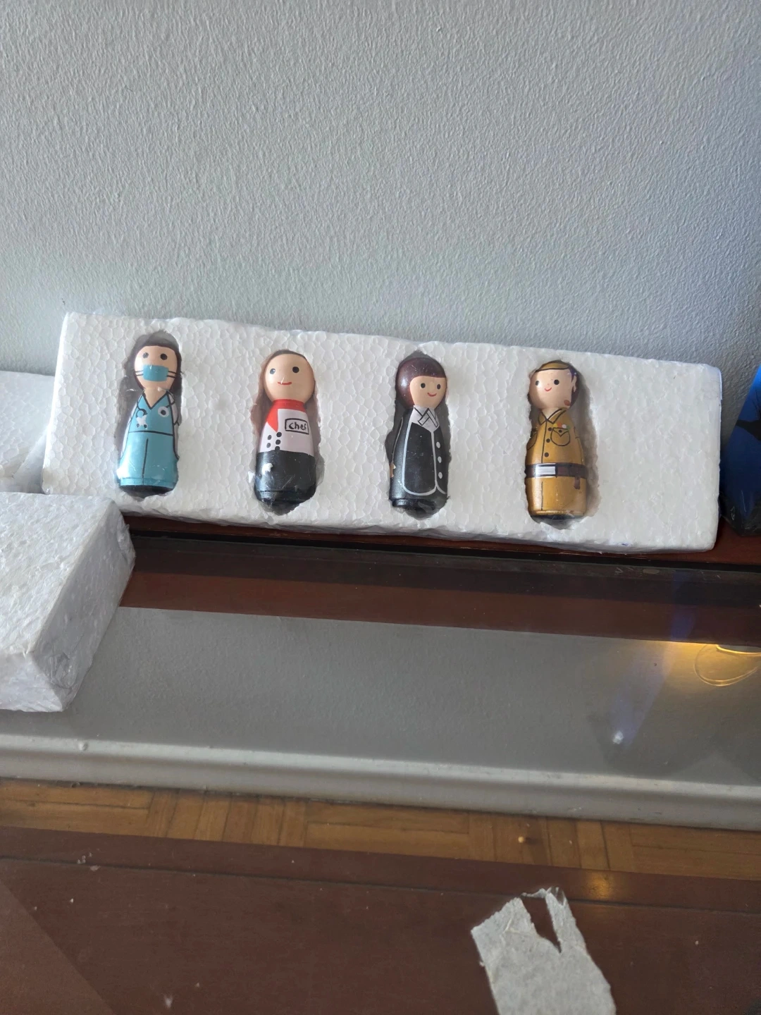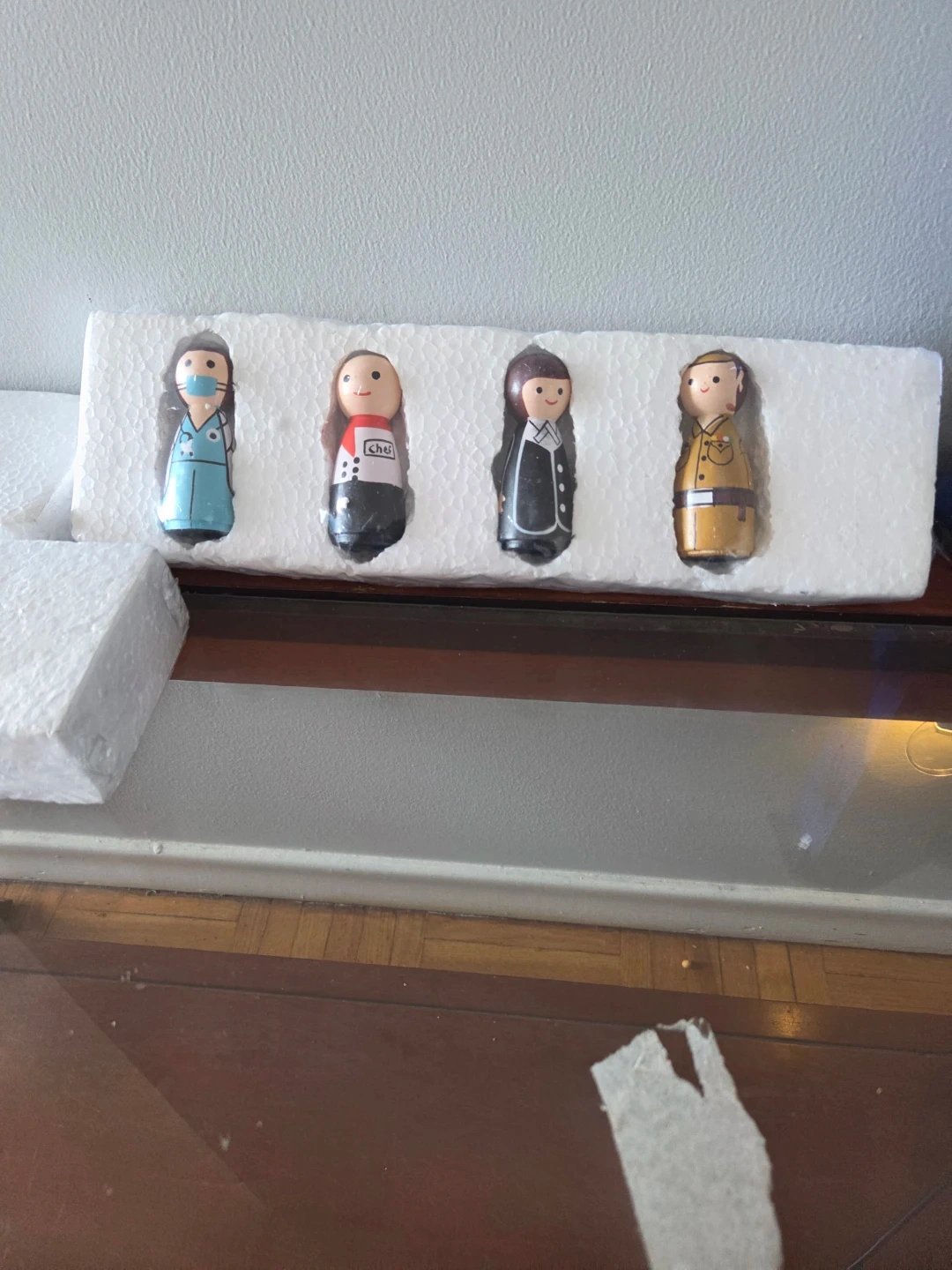 A set of four painted wooden peg dolls. These figures depict different professions including a nurse, a person in athletic wear, and two in formal attire. They're housed in protective styrofoam packaging. Great for imaginative play!