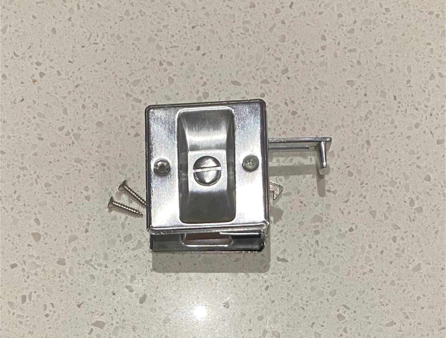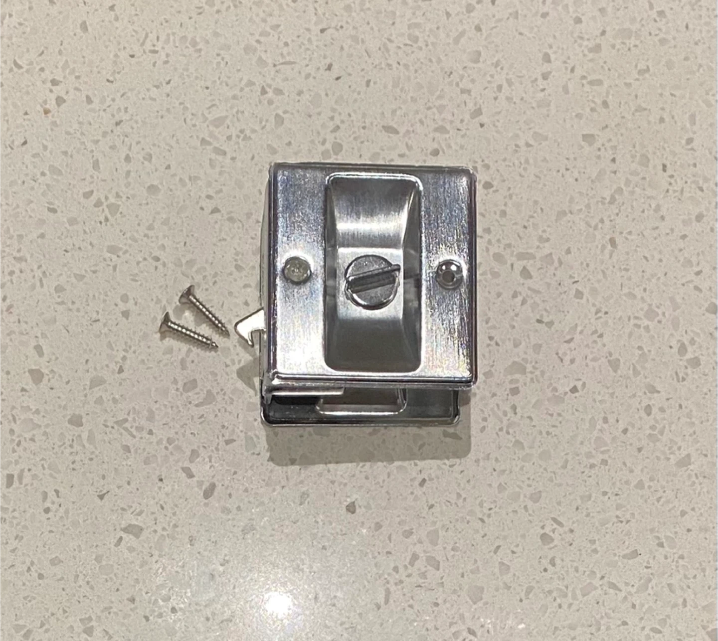 This is a sliding pocket door lock assembly. It's made of metal with a brushed finish. Includes two mounting screws. Pick up at Weston and Eglinton.