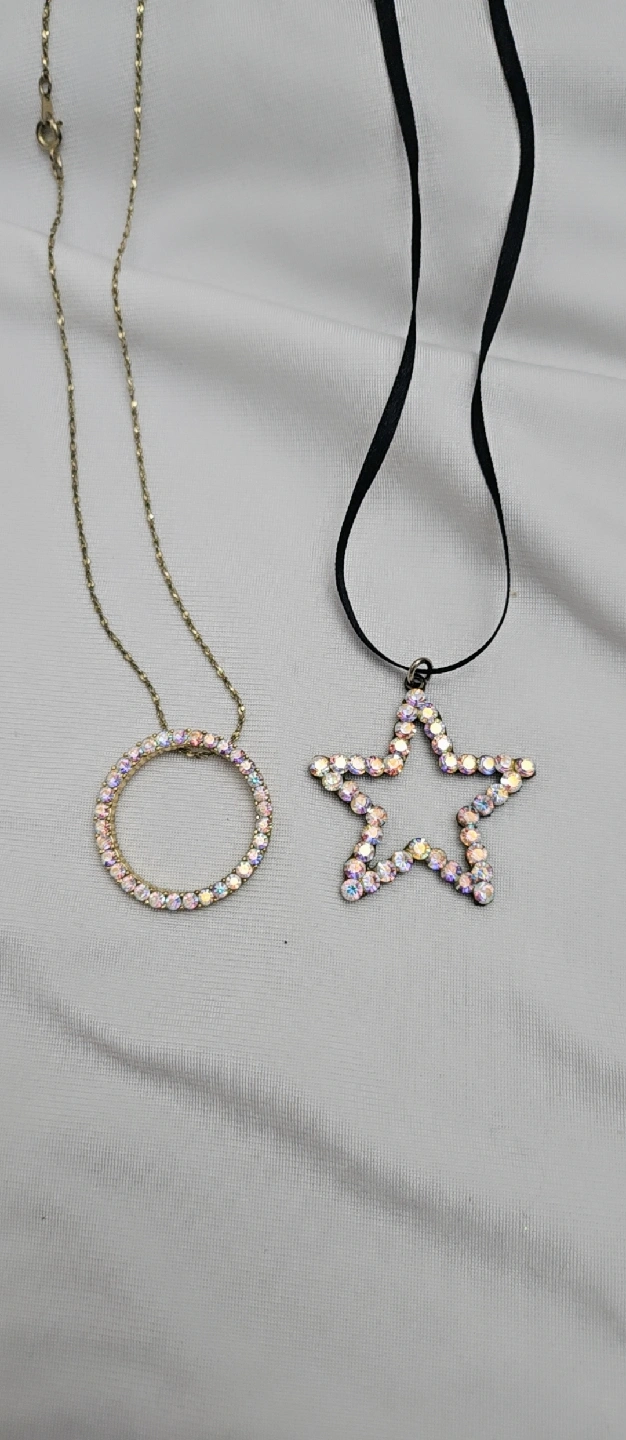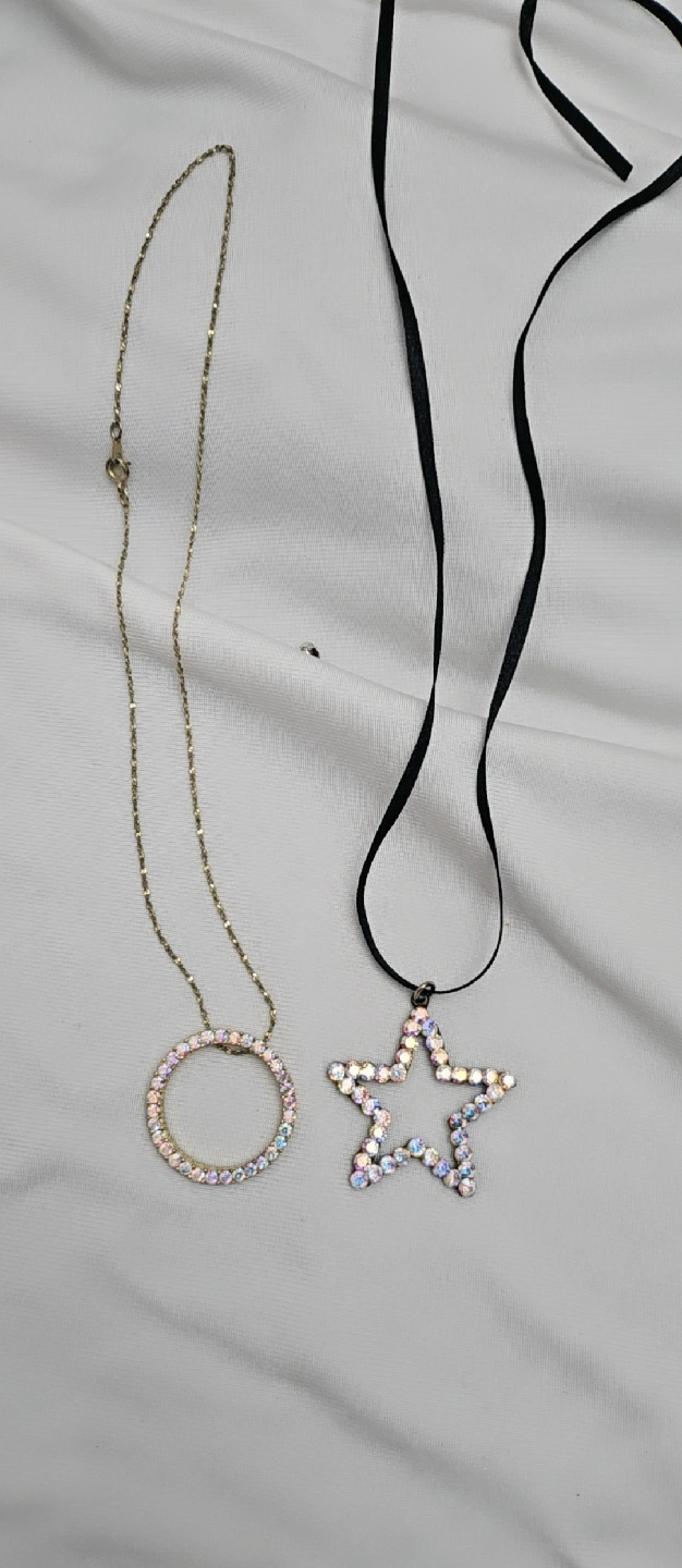 💫💜Selling two cute necklaces! One is a gold-toned chain with a circle pendant, and the other is a black ribbon necklace with a star pendant. Both are adorned with sparkly stones
