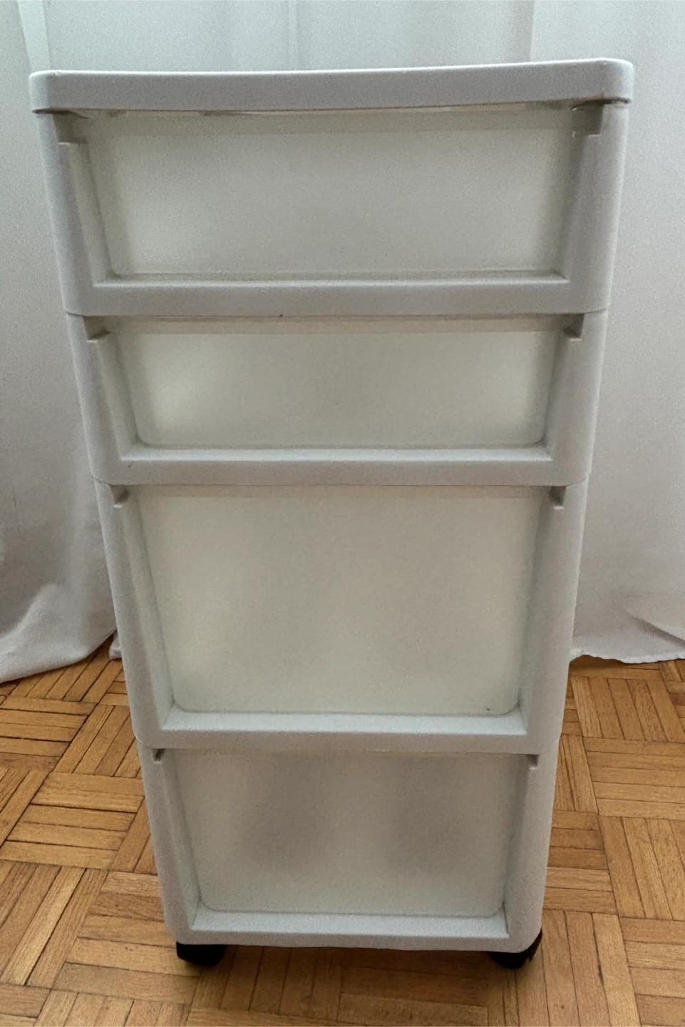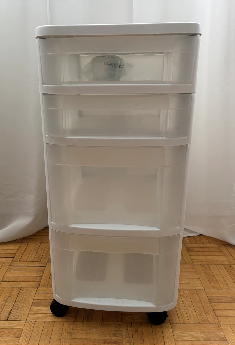 White 4-drawer rolling cart. This unit has wheels for easy mobility. Perfect for organizing crafts, clothes, or office supplies.