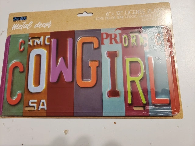 Up for sale we have a New Colourful tin sign licence plate it COWGIRL it is 12 by 6 inches in dimension pick up on old Richmond Road in Nepean