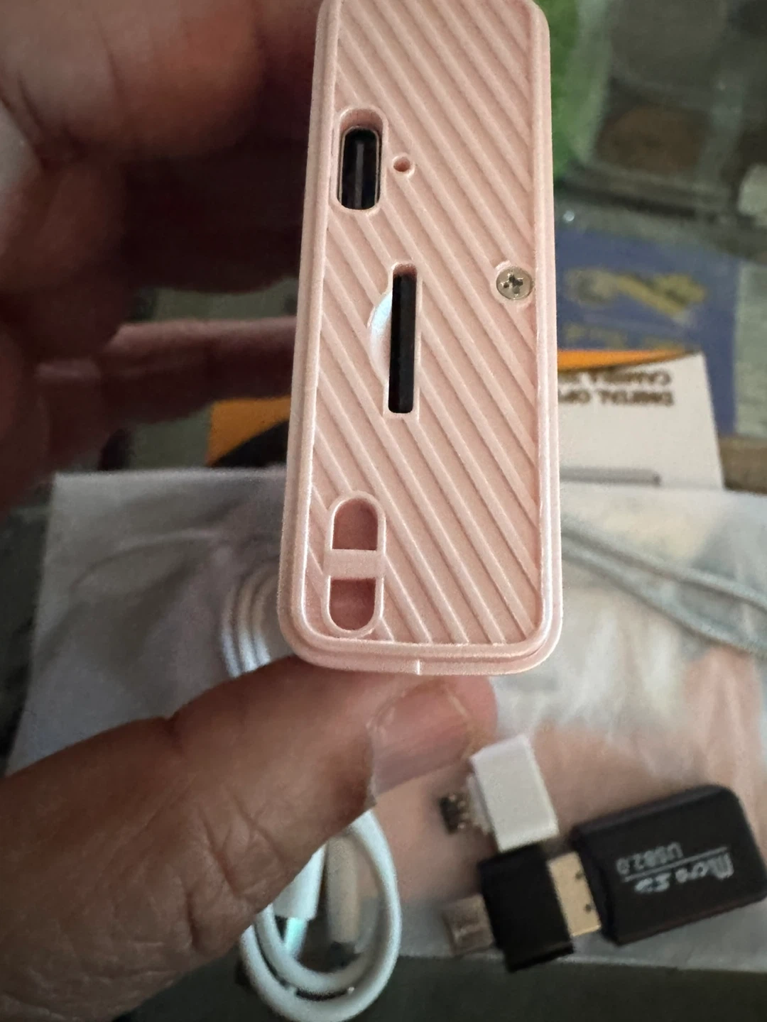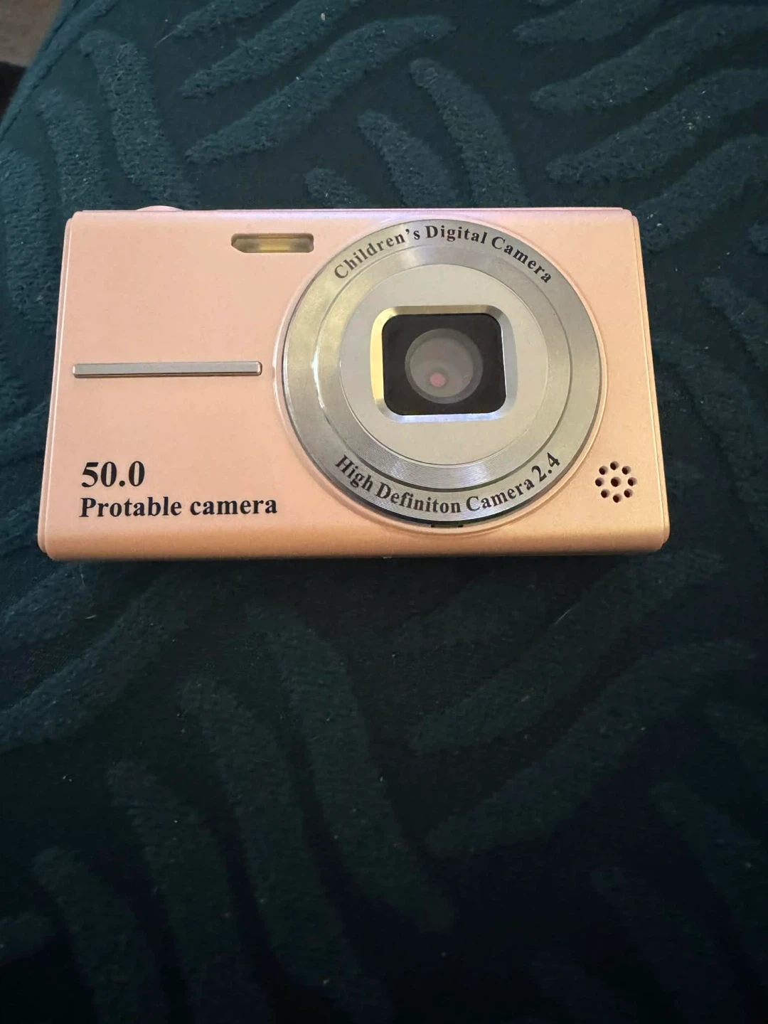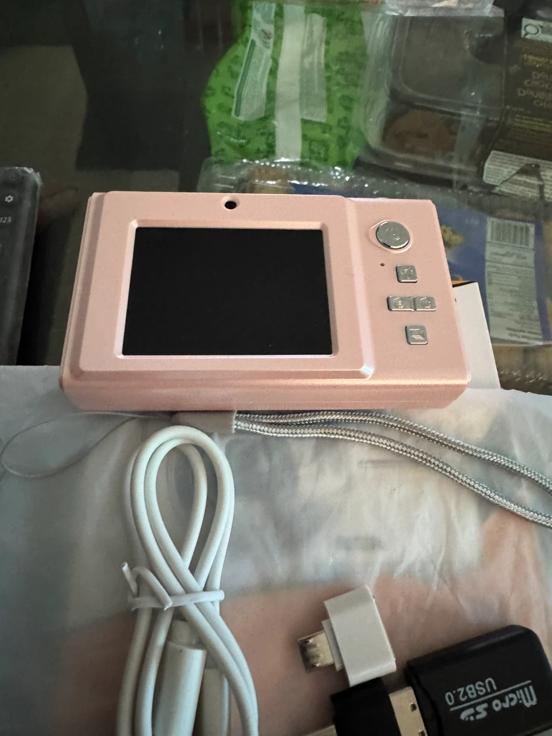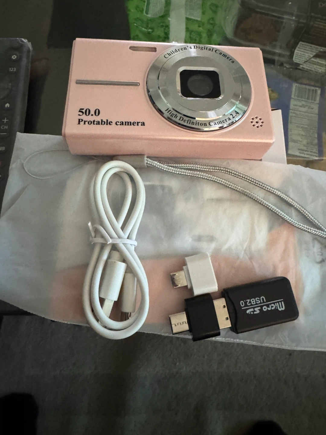 This is a pink children's digital camera. It's portable and has high definition. Comes with a USB cable and card reader.