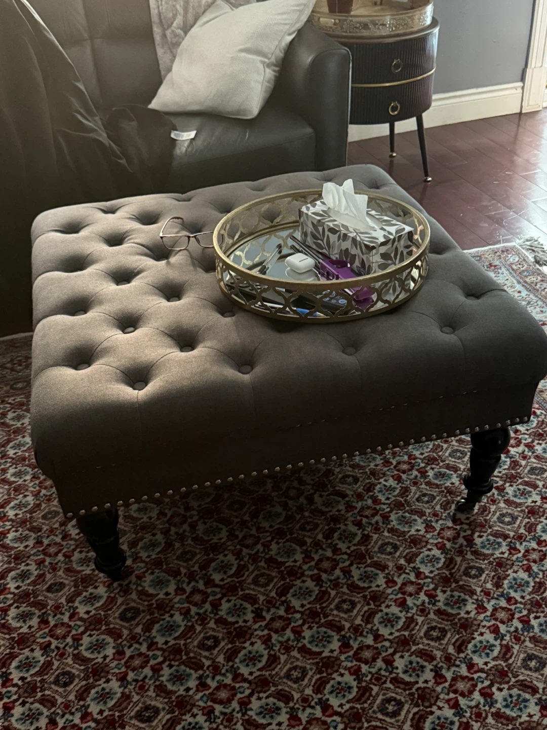 grey tufted ottoman. It's in great condition and would look great in any living room! It has a soft, comfortable top and sturdy legs