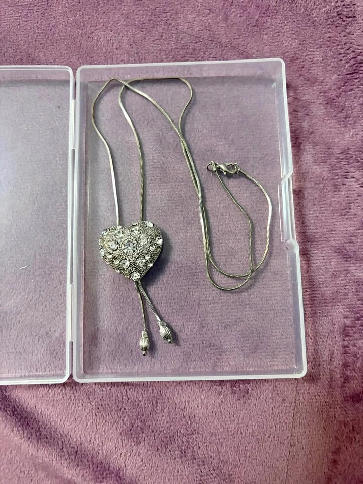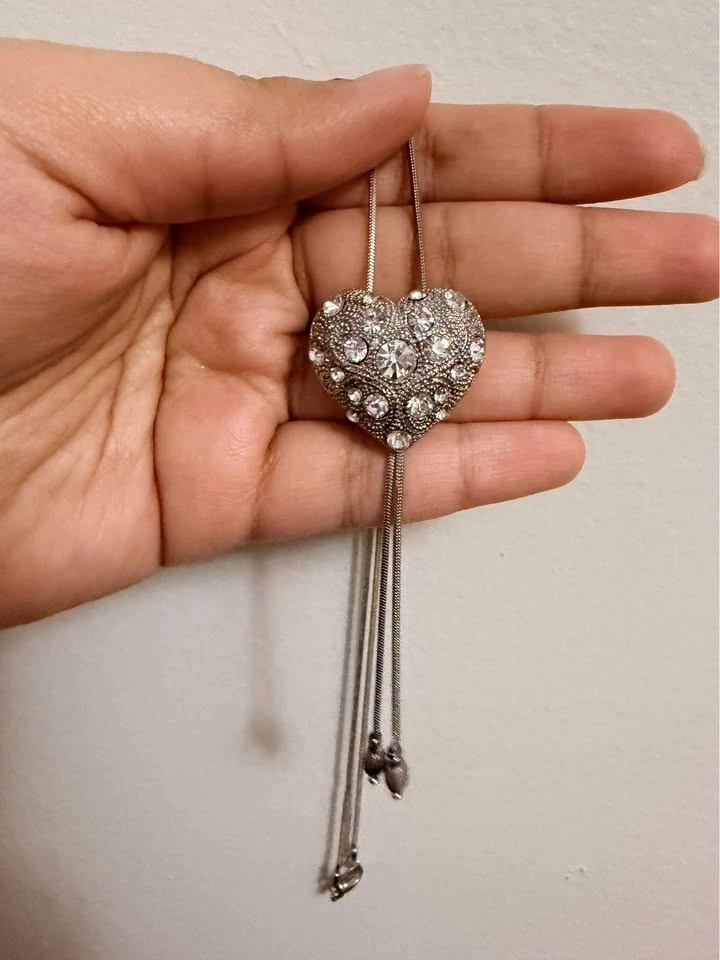 Sparkly silver-toned necklace with a heart-shaped pendant featuring clear rhinestones. It has a thin snake chain and an adjustable bolo-style slide. The metal is bright and all stones are intact. Pickup in East Vancouver.