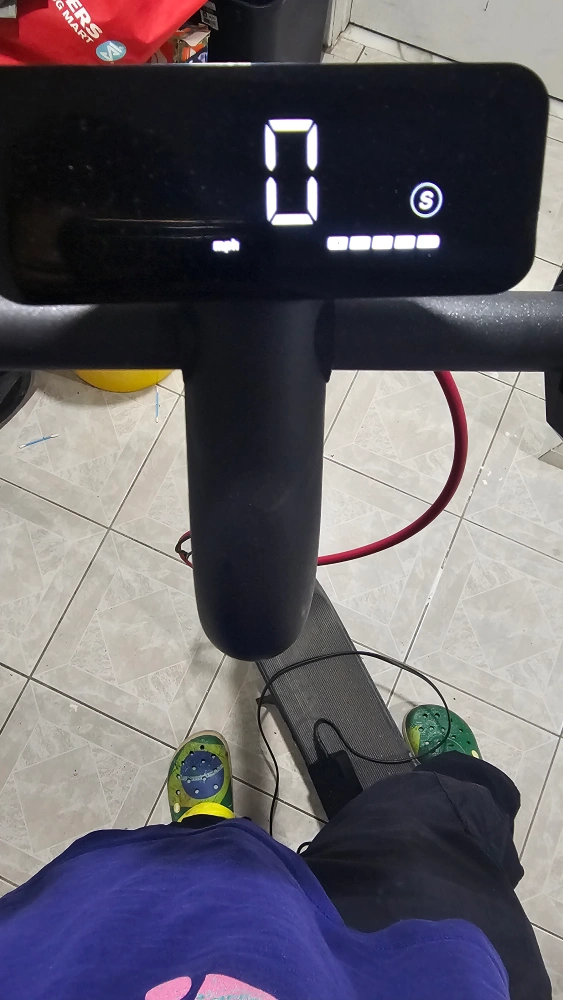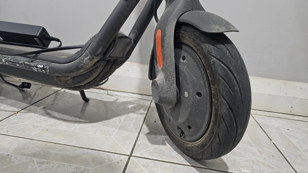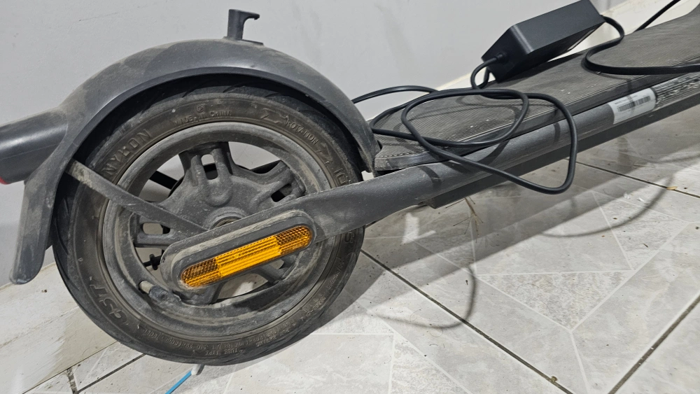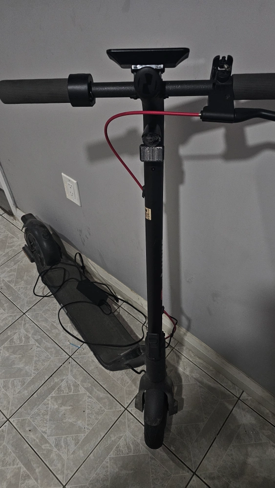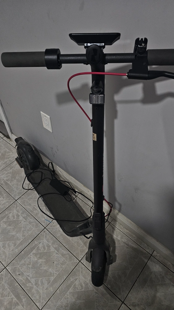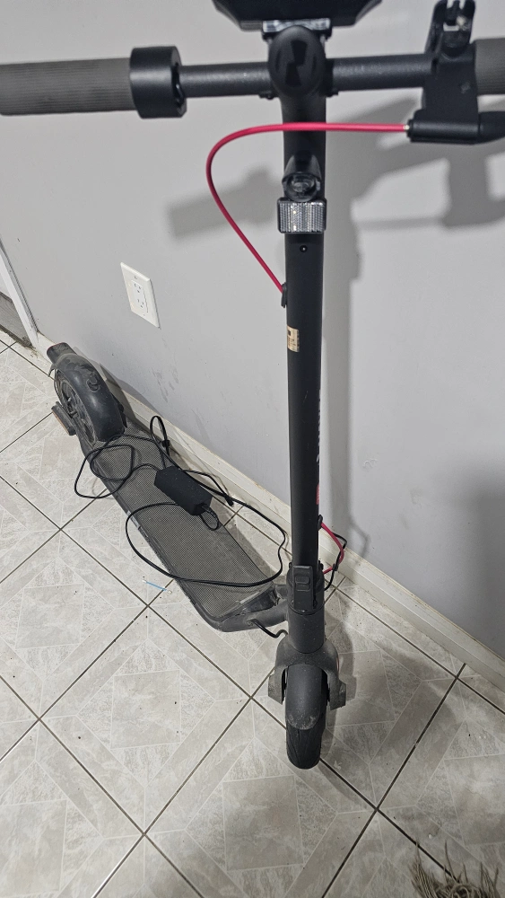 Electric scooter. Includes charger. Comes with a kickstand. Used but in good condition. Some minor scratches and wear and tear, but all functions work great.