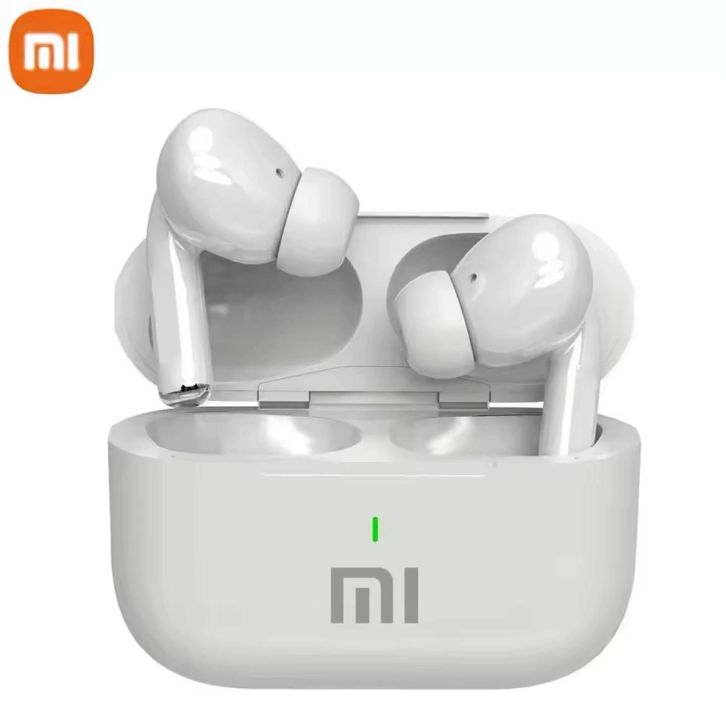 White wireless earbuds with charging case. Excellent sound quality. Portable and convenient.