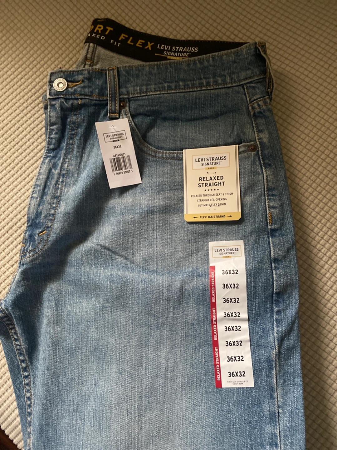 Selling a new pair of Levi Strauss Signature Relaxed Fit jeans. They're size 36x32 and have a relaxed straight fit through the seat and thigh with a straight leg opening. They also feature a flex waistband