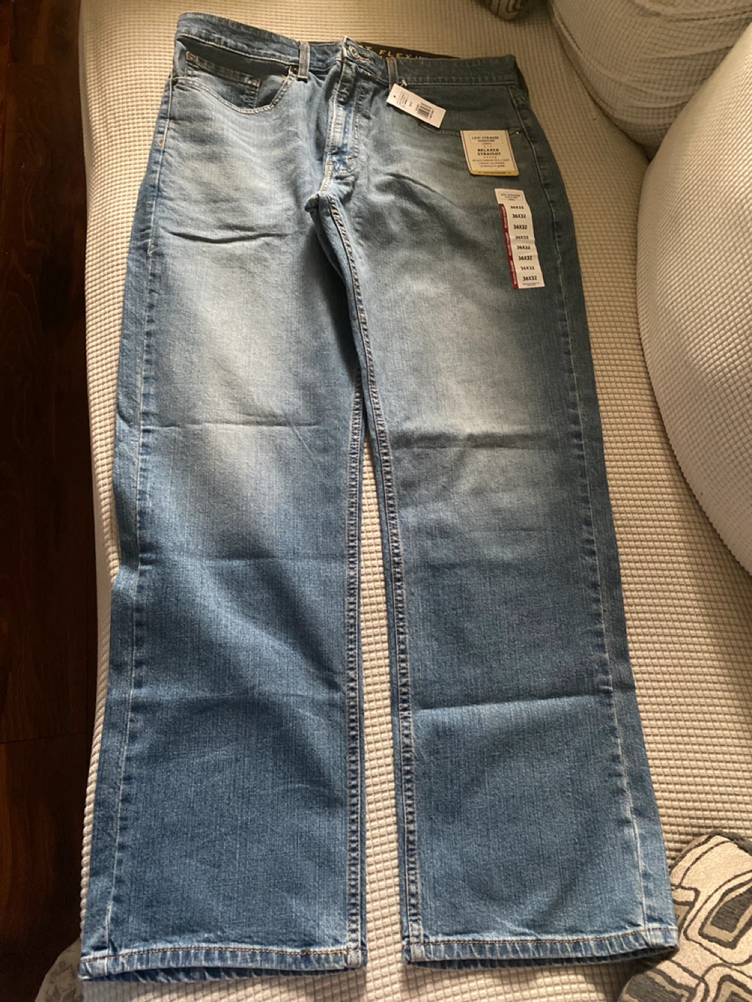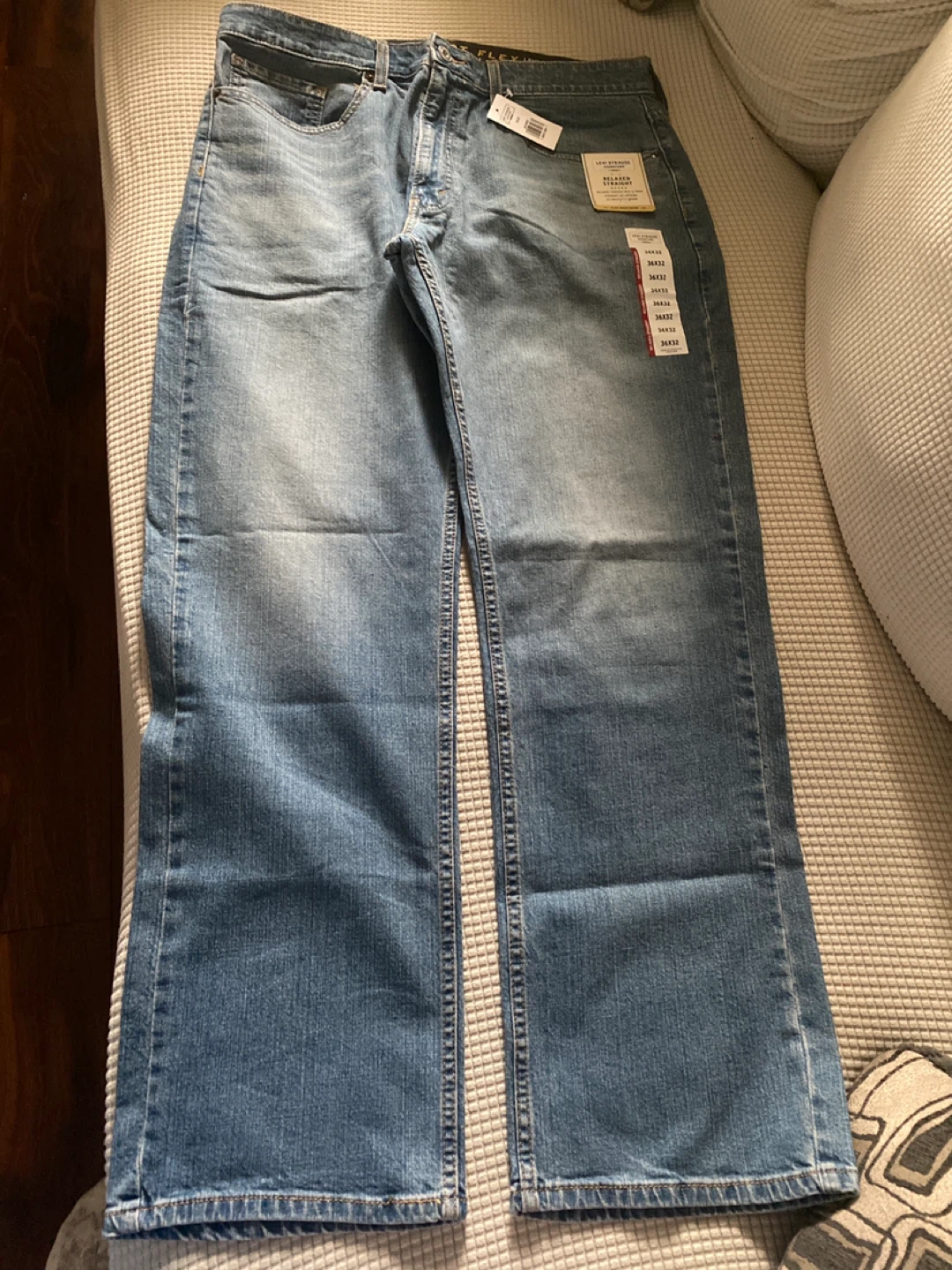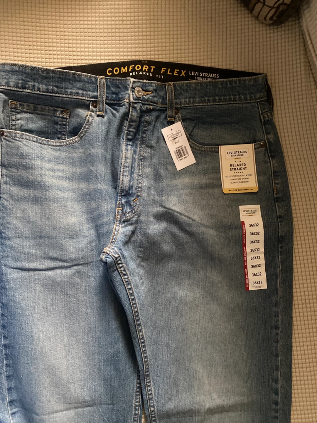 Selling a new pair of Levi Strauss Signature Relaxed Fit jeans. They're size 36x32 and have a relaxed straight fit through the seat and thigh with a straight leg opening. They also feature a flex waistband