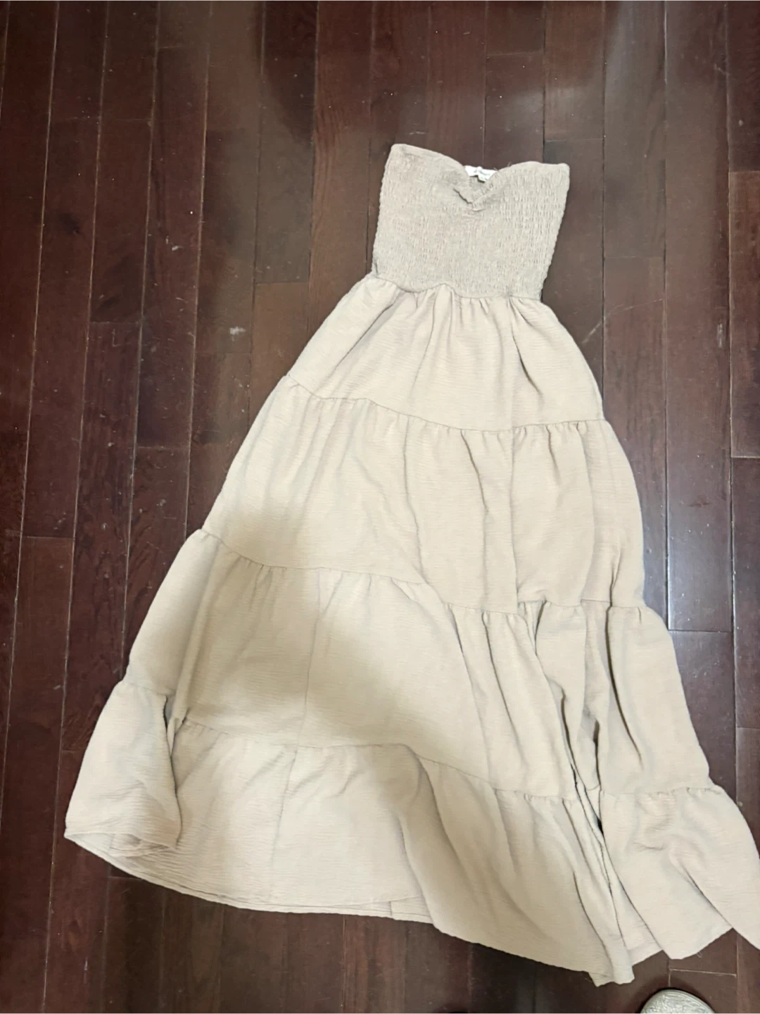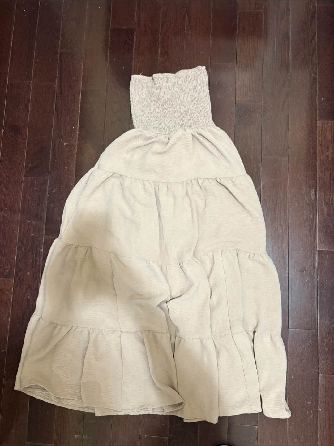 This beige midi dress features a smocked bodice and a tiered skirt for a relaxed fit. It's made from a lightweight, textured fabric. It's a versatile piece for casual wear.