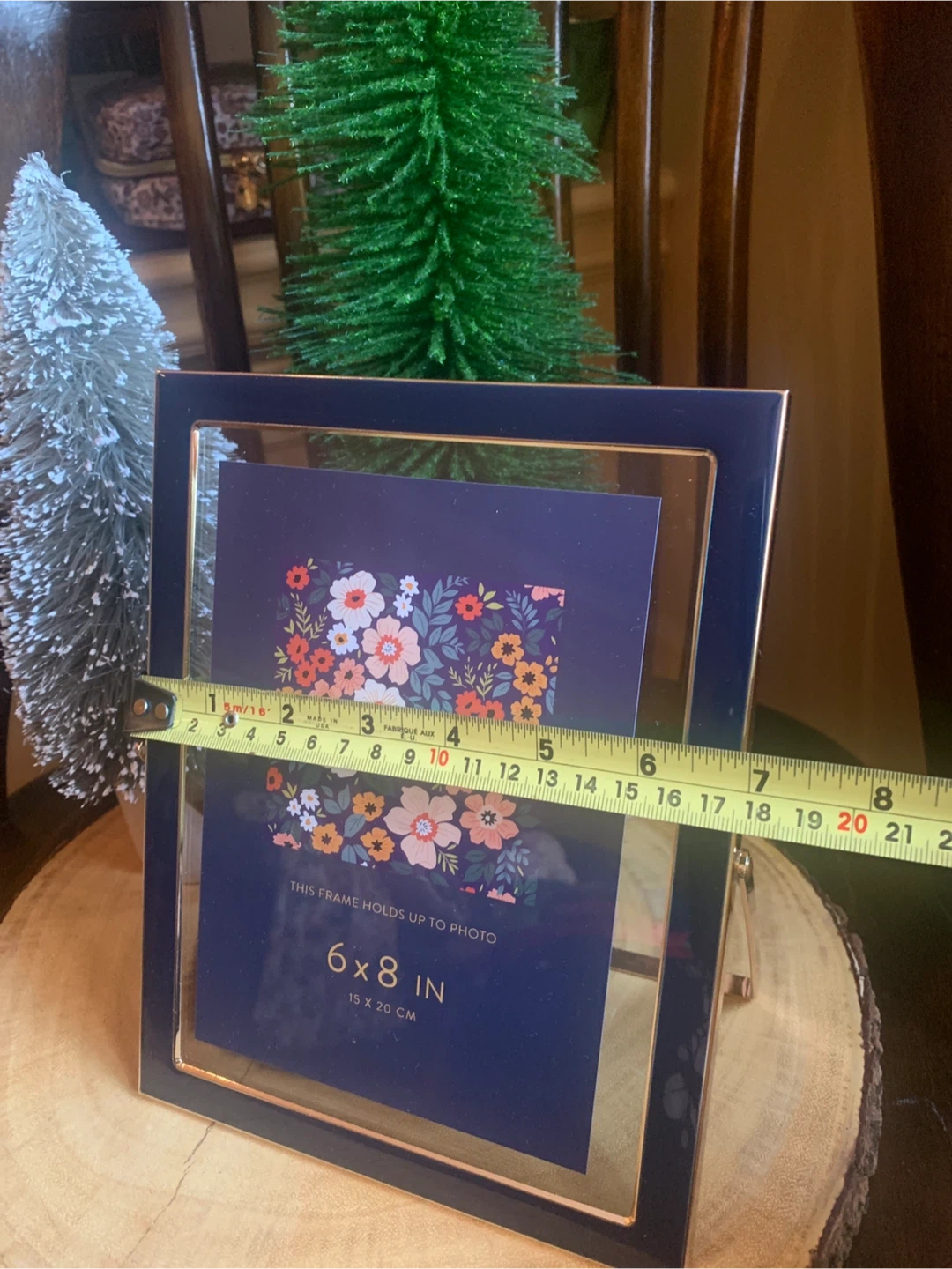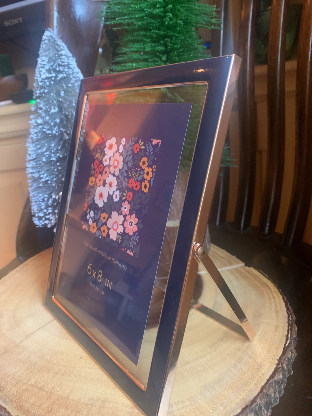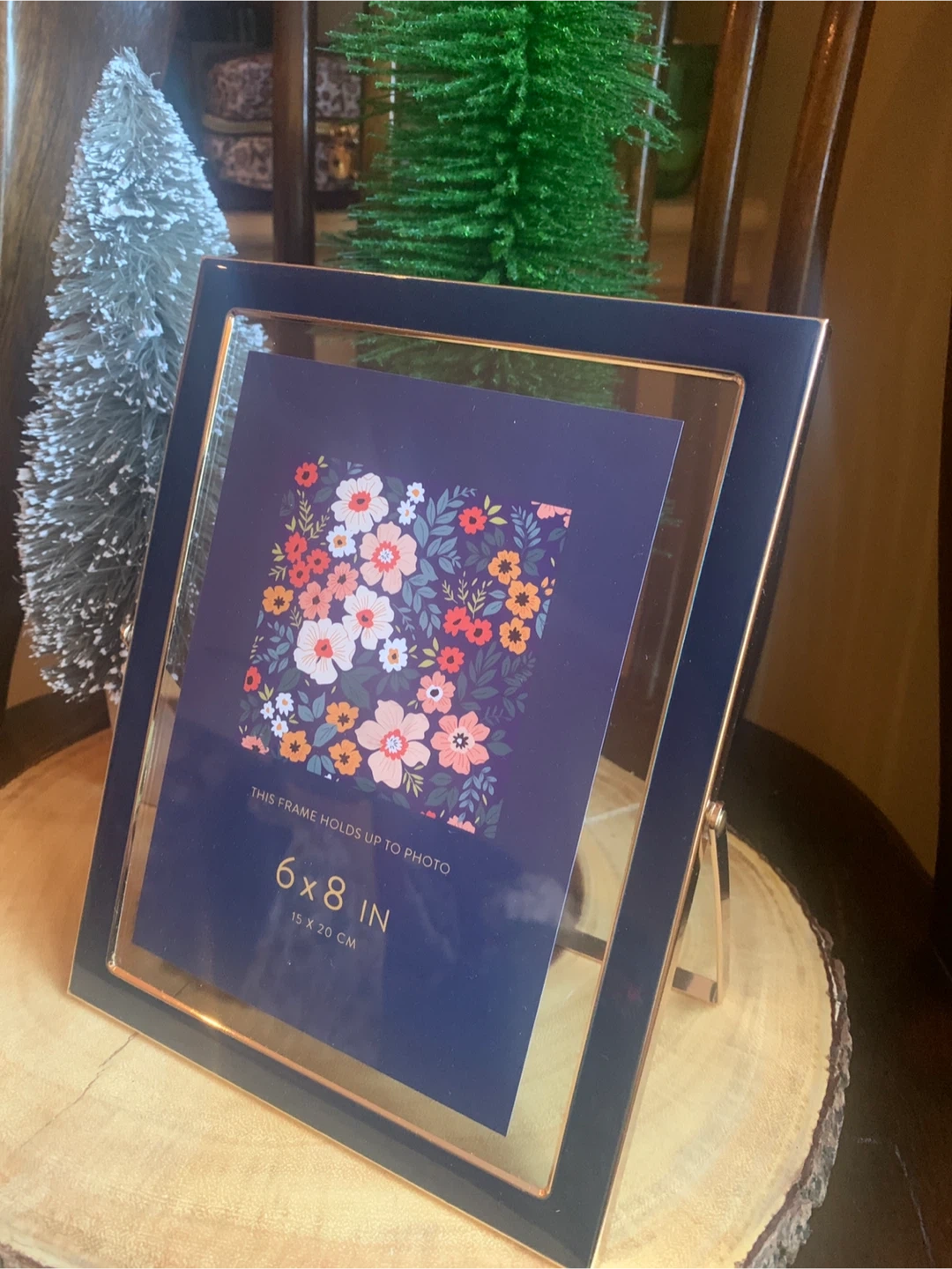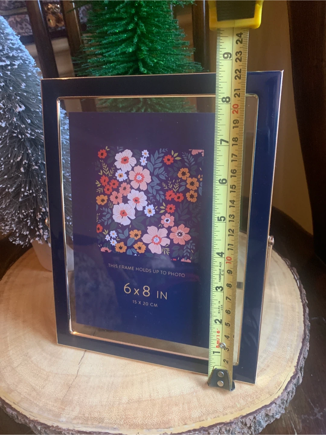A really pretty navy blue enamel floating photo frame by Axeman! This frame is a 6x8 inch photo frame with a navy blue border and rose gold trim for the frame. The whole frame is 9” x 7”. It's suitable for displaying photos on a desk, table or shelf. Its classic easel design complements most decor.