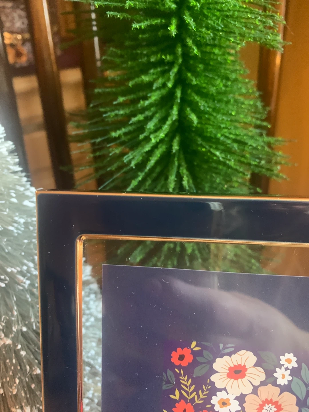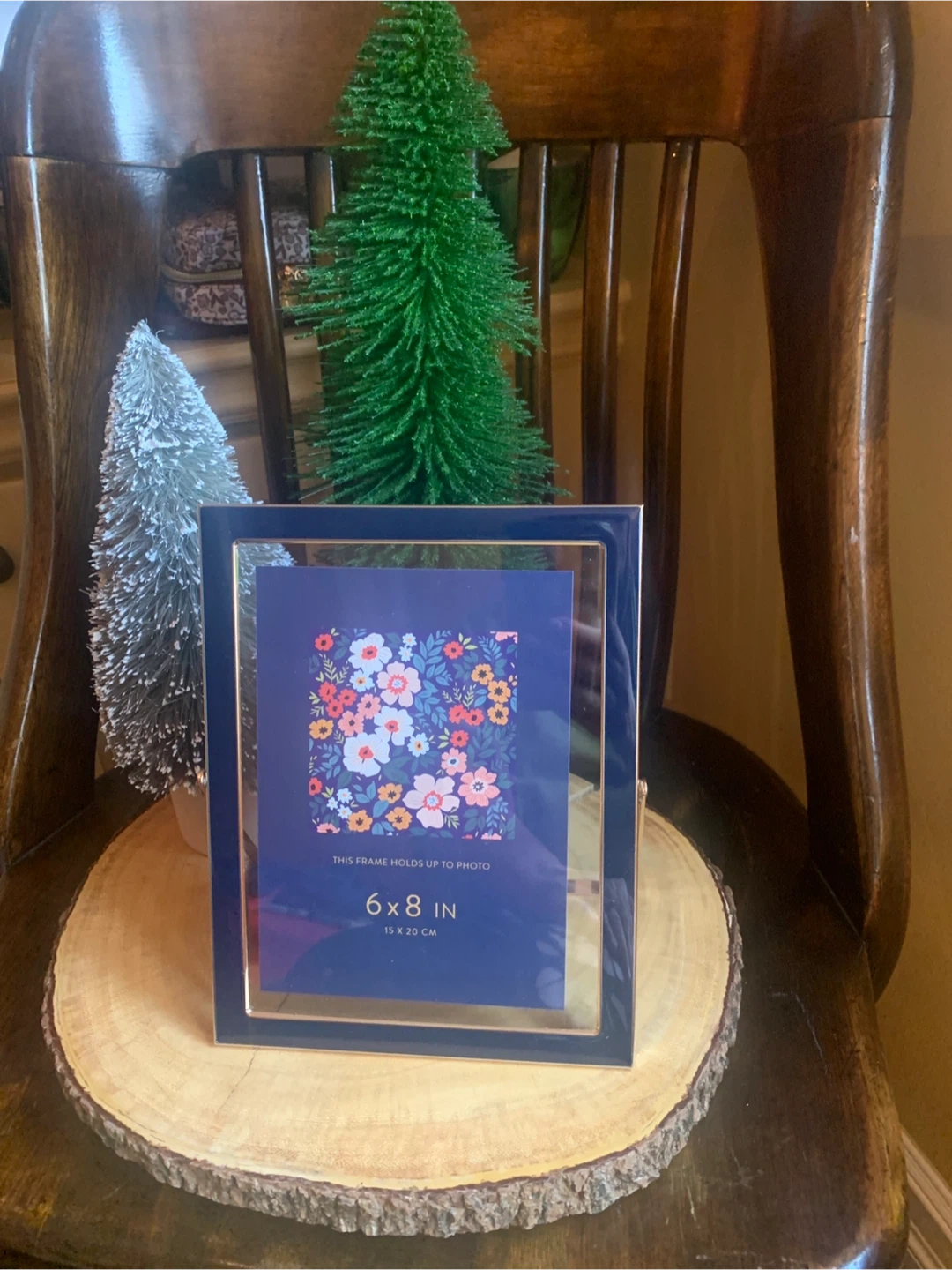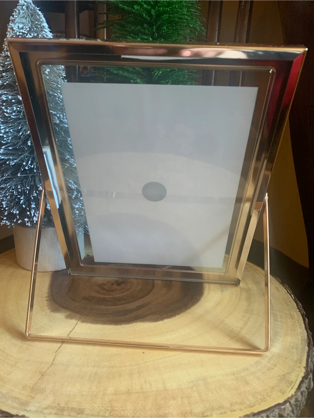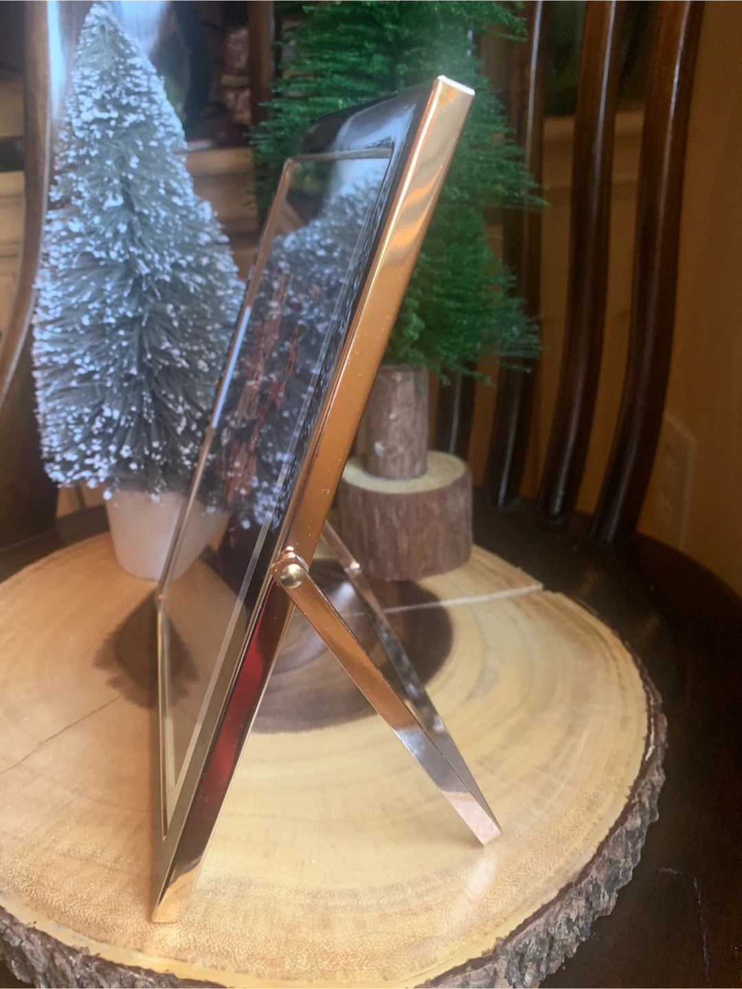 A really pretty navy blue enamel floating photo frame by Axeman! This frame is a 6x8 inch photo frame with a navy blue border and rose gold trim for the frame. The whole frame is 9” x 7”. It's suitable for displaying photos on a desk, table or shelf. Its classic easel design complements most decor.