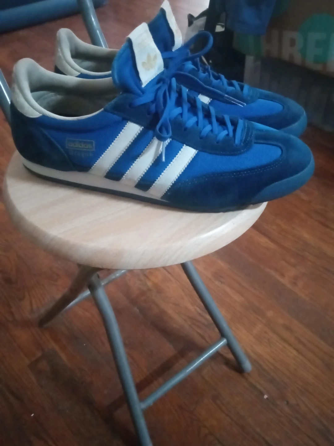 These are a Rare pair of Adidas Dragon sneakers in blue. They feature the classic three stripes in white. The shoes are in good condition with some signs of wear. Perfect for casual wear or sports!