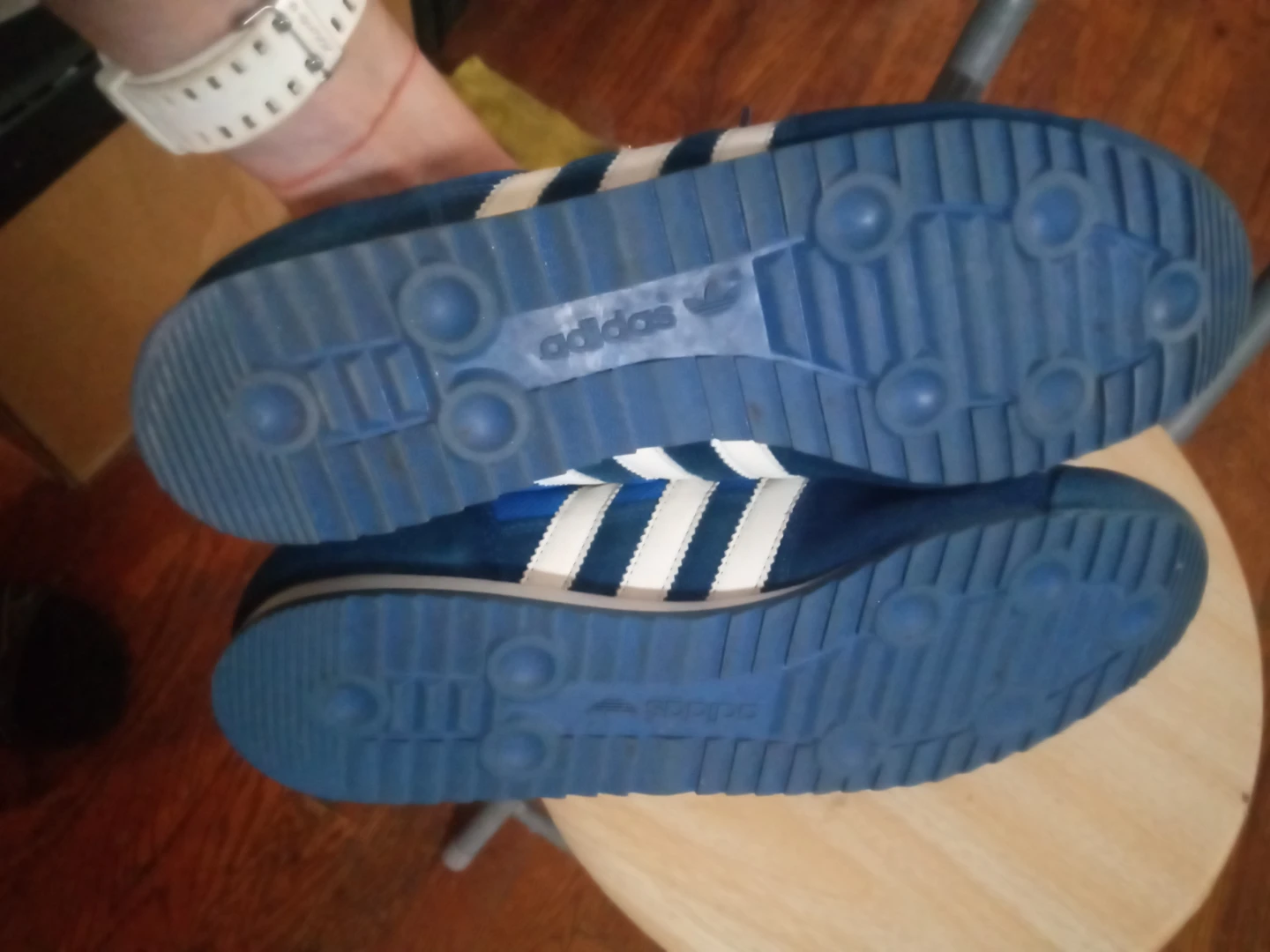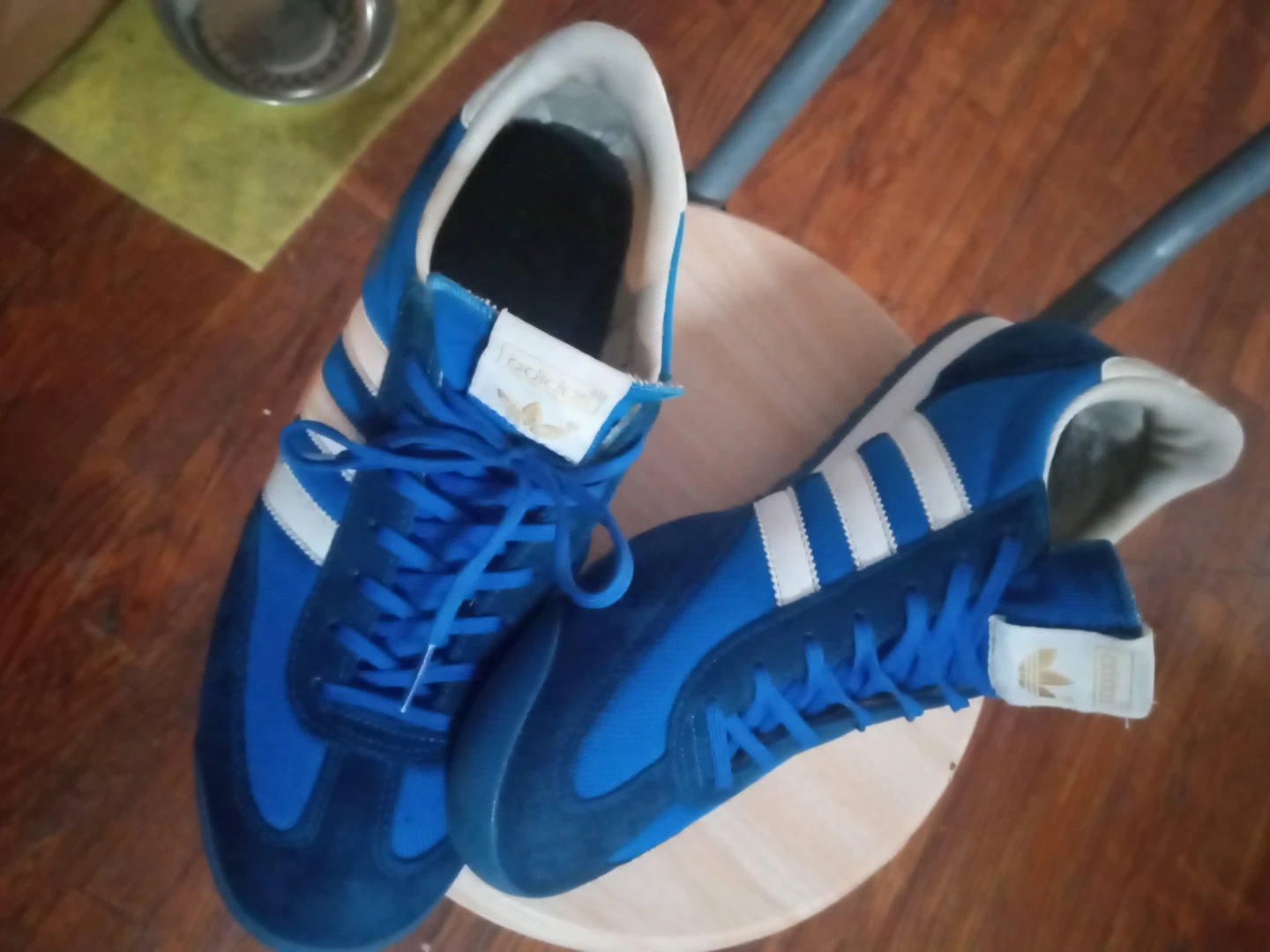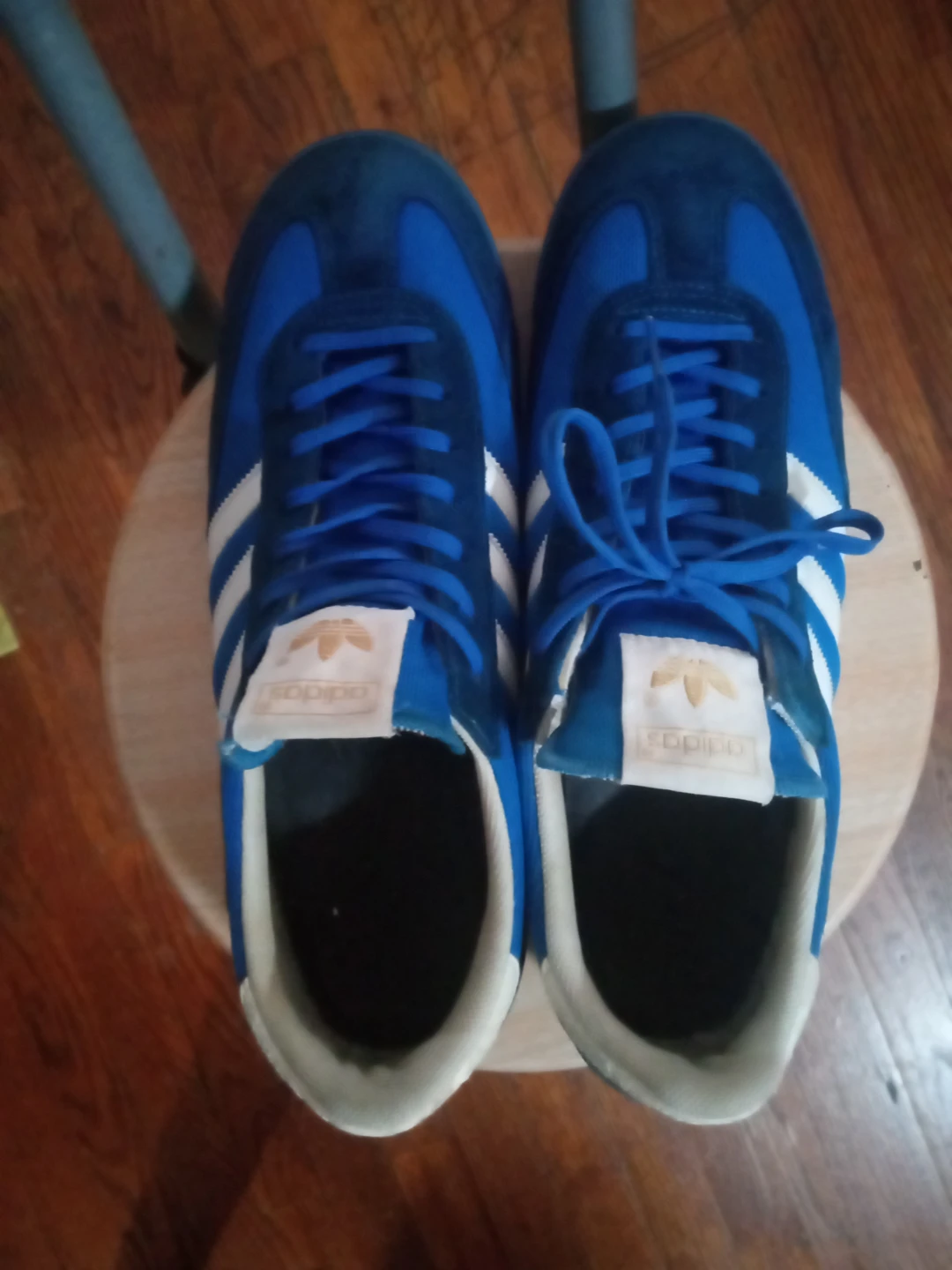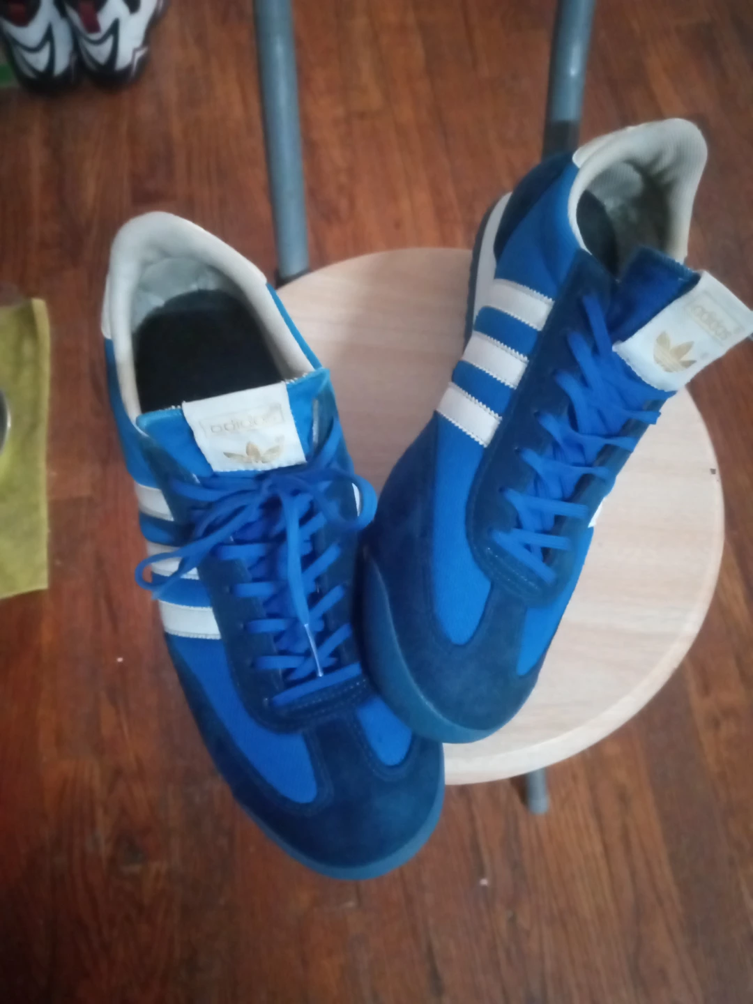 These are a Rare pair of Adidas Dragon sneakers in blue. They feature the classic three stripes in white. The shoes are in good condition with some signs of wear. Perfect for casual wear or sports!