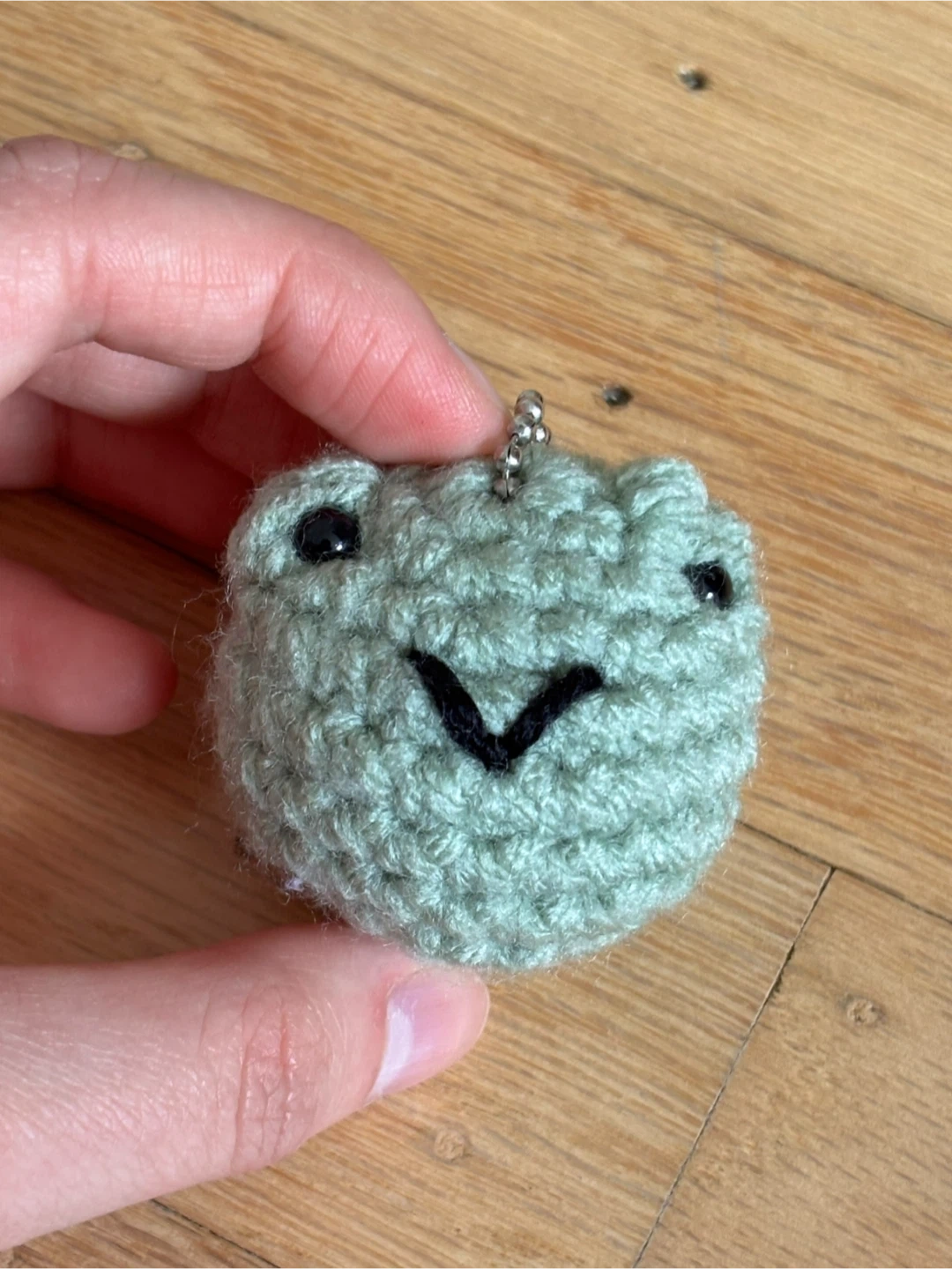 This is a cute, handmade crochet frog keychain. It's light green with black bead eyes and a black yarn mouth. It has a silver ball chain attachment.
