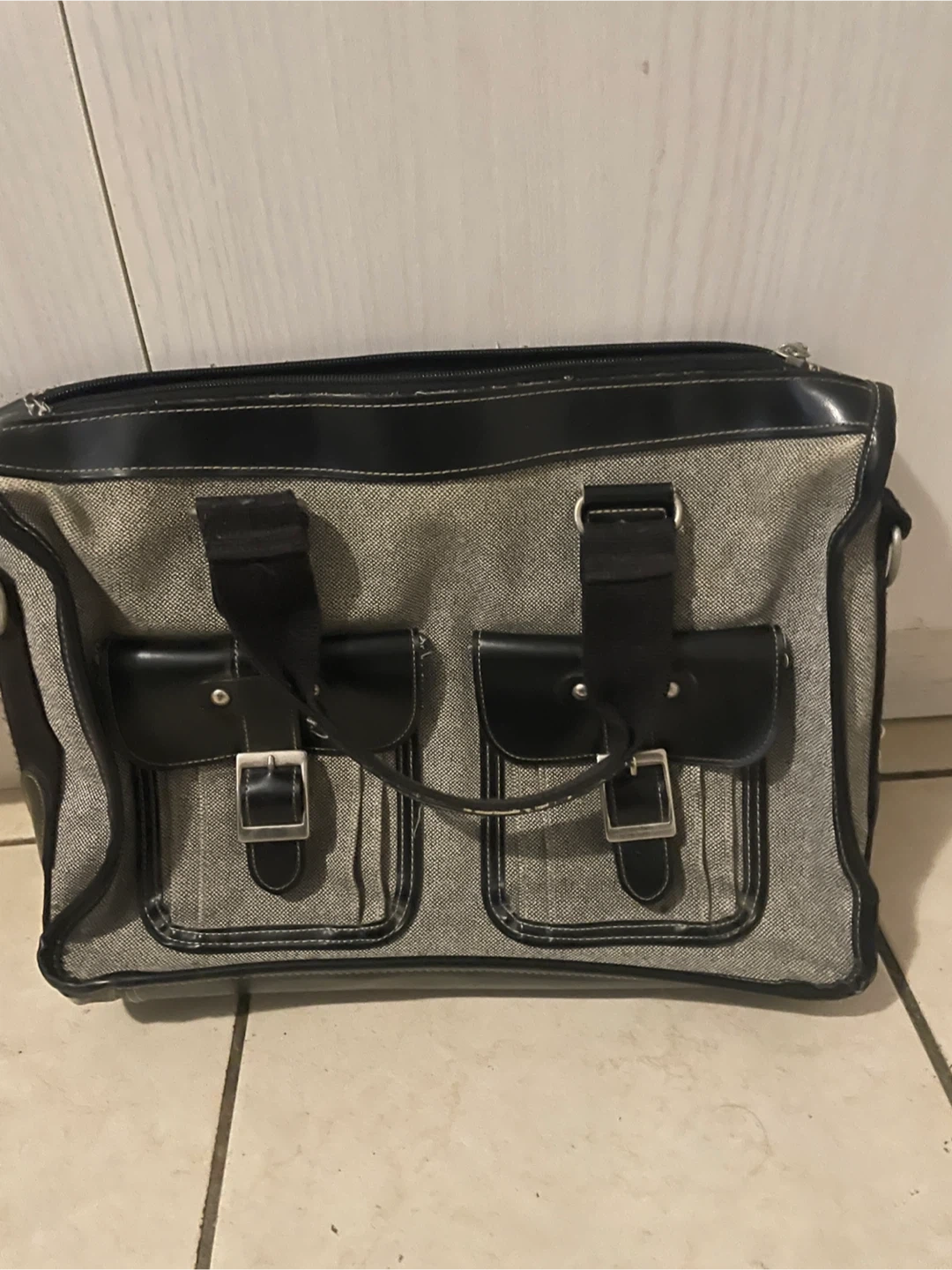 Here's a stylish grey and black bag! It's in good condition and ready for a new home. Perfect for everyday use or travel