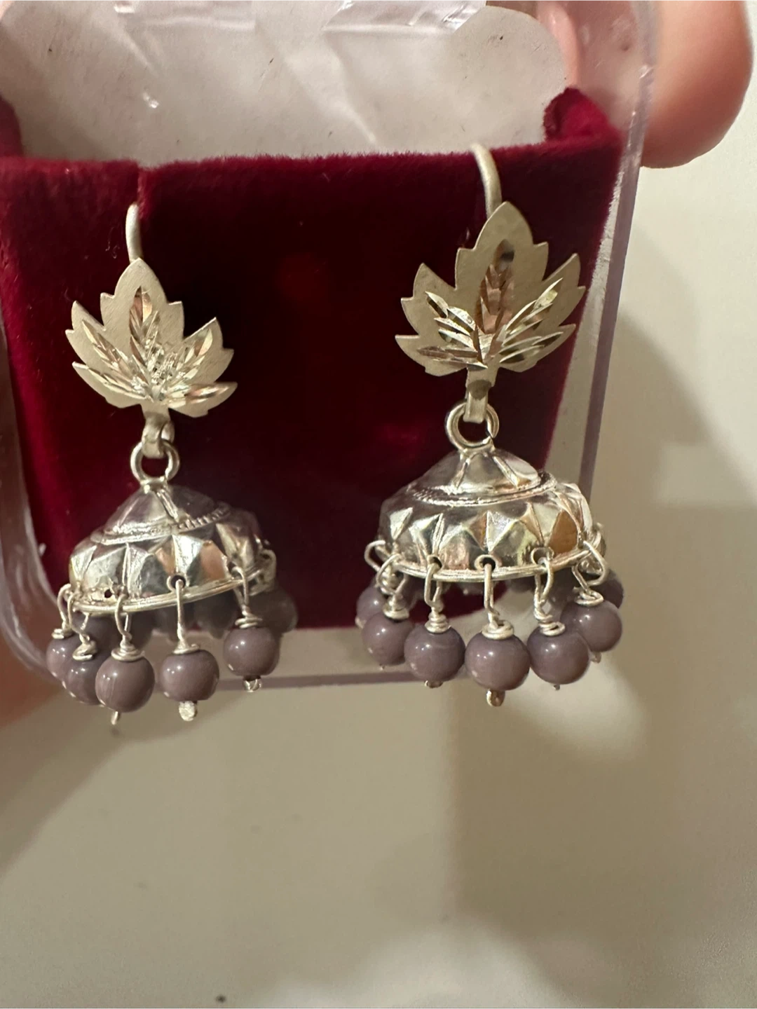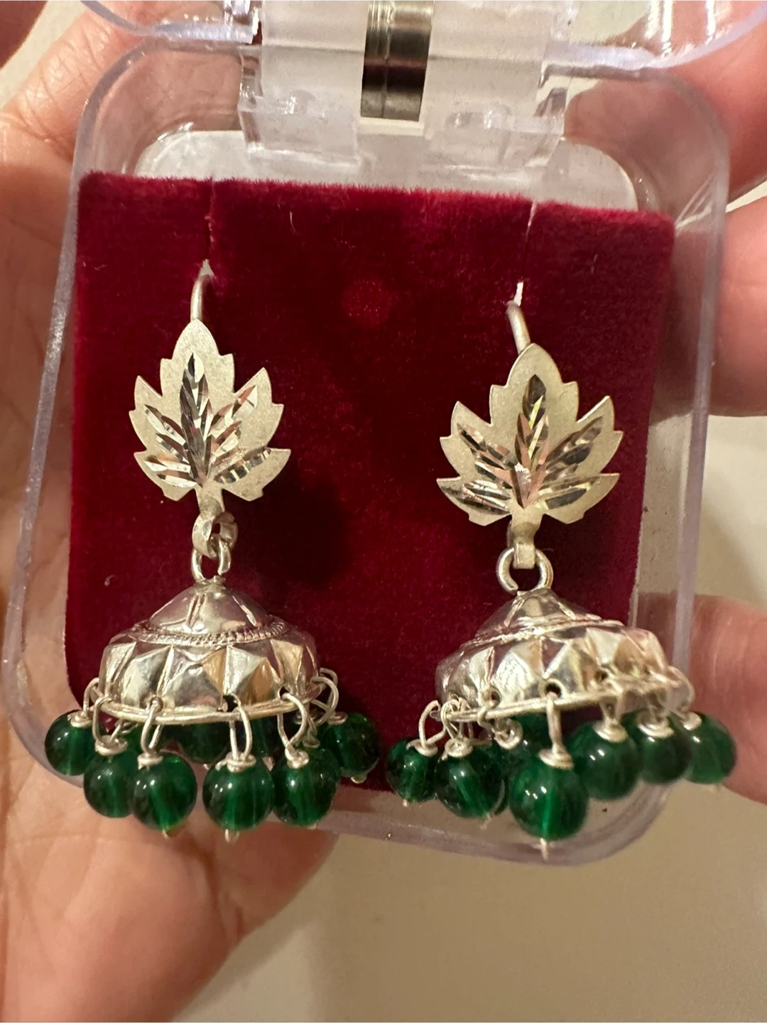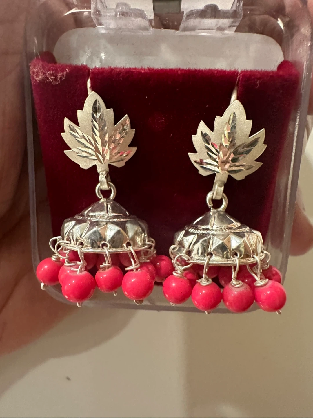 Selling a pair of beautiful jhumka earrings with a maple leaf design. They come in a variety of colours: red, blue, grey, white, and green. Perfect for adding a touch of Canadian flair to any outfit!
