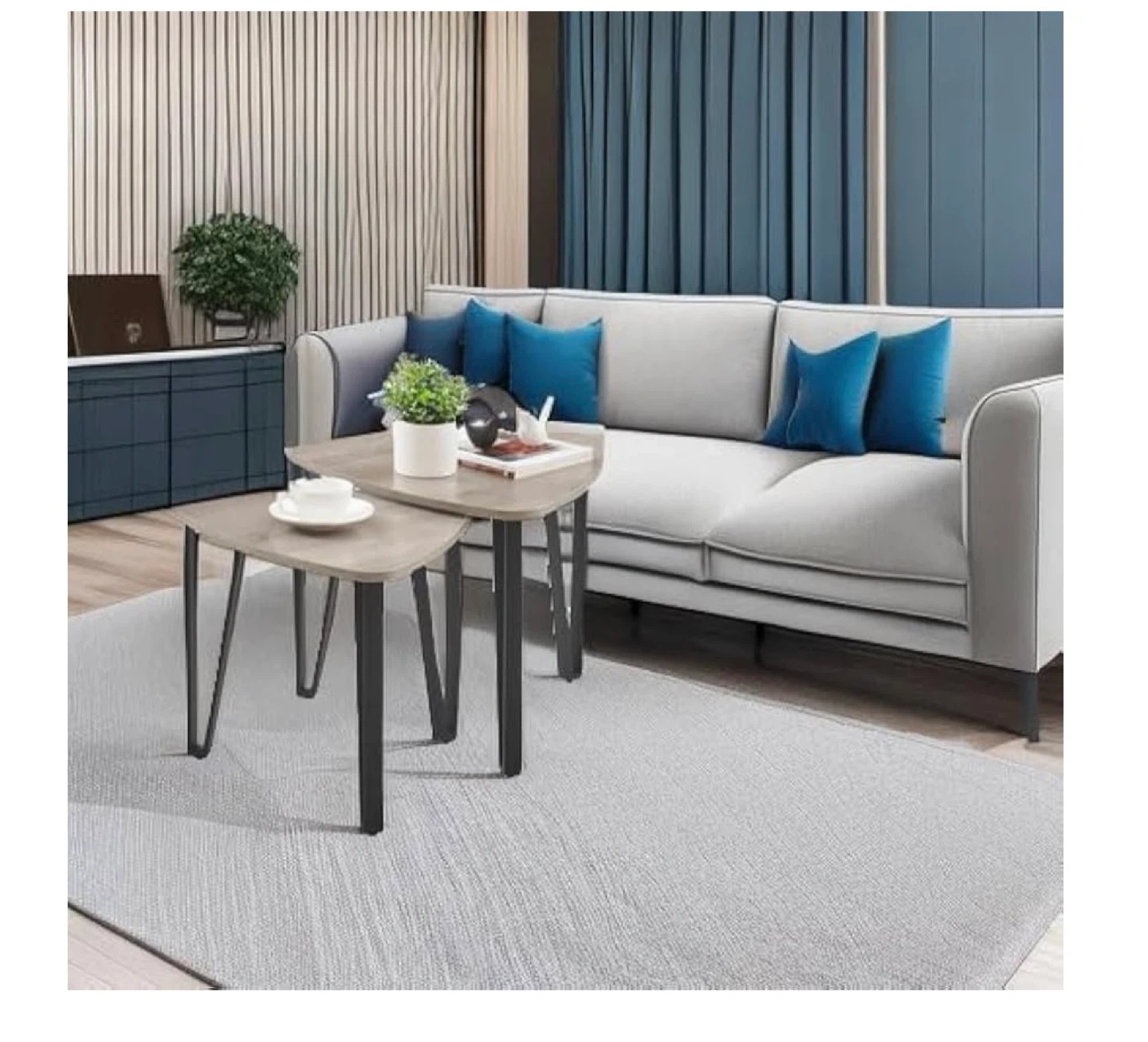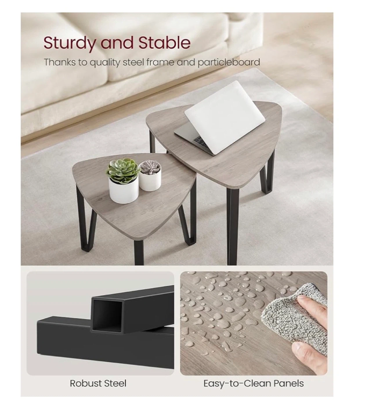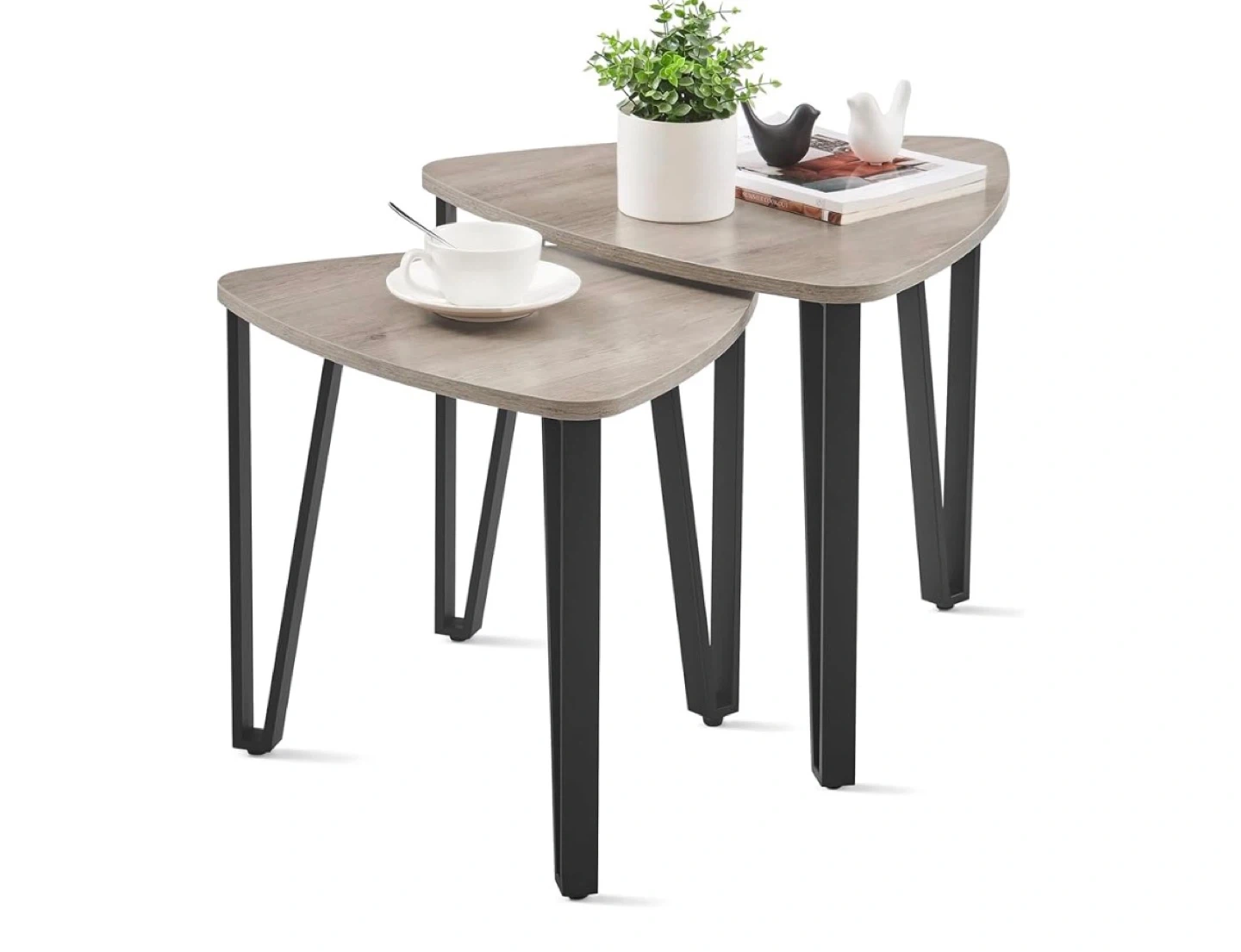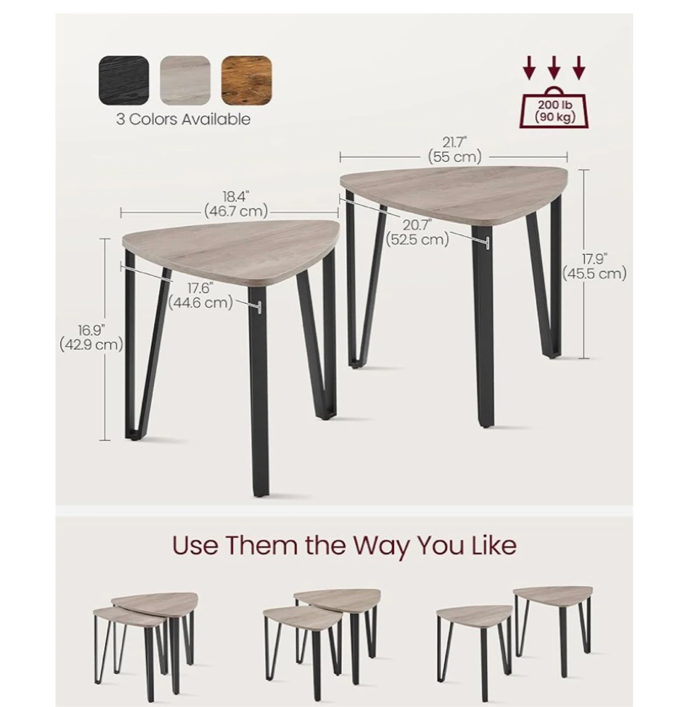 This set includes two triangular nesting coffee tables with a wood-grain finish and black metal legs. The larger table measures 21.7" (55 cm) wide and 17.9" (45.5 cm) high, while the smaller one is 18.4" (46.7 cm) wide and 16.9" (42.9 cm) high. They're made with quality steel frames and particleboard panels, supporting up to 200 lb (90 kg). These tables offer versatile arrangement options for any living space.
