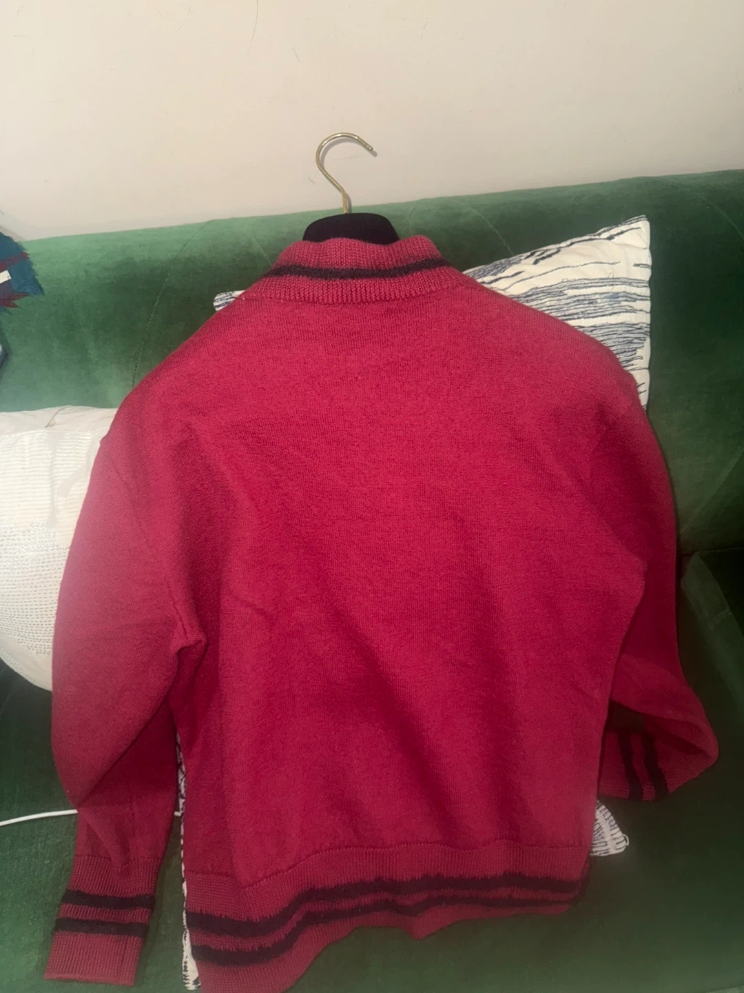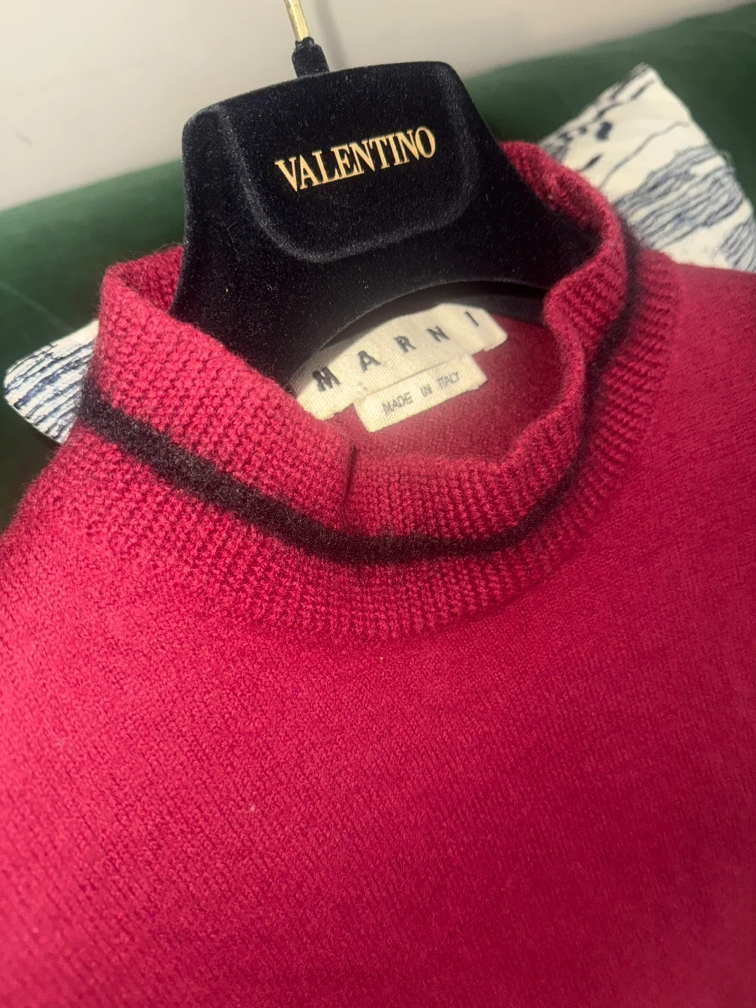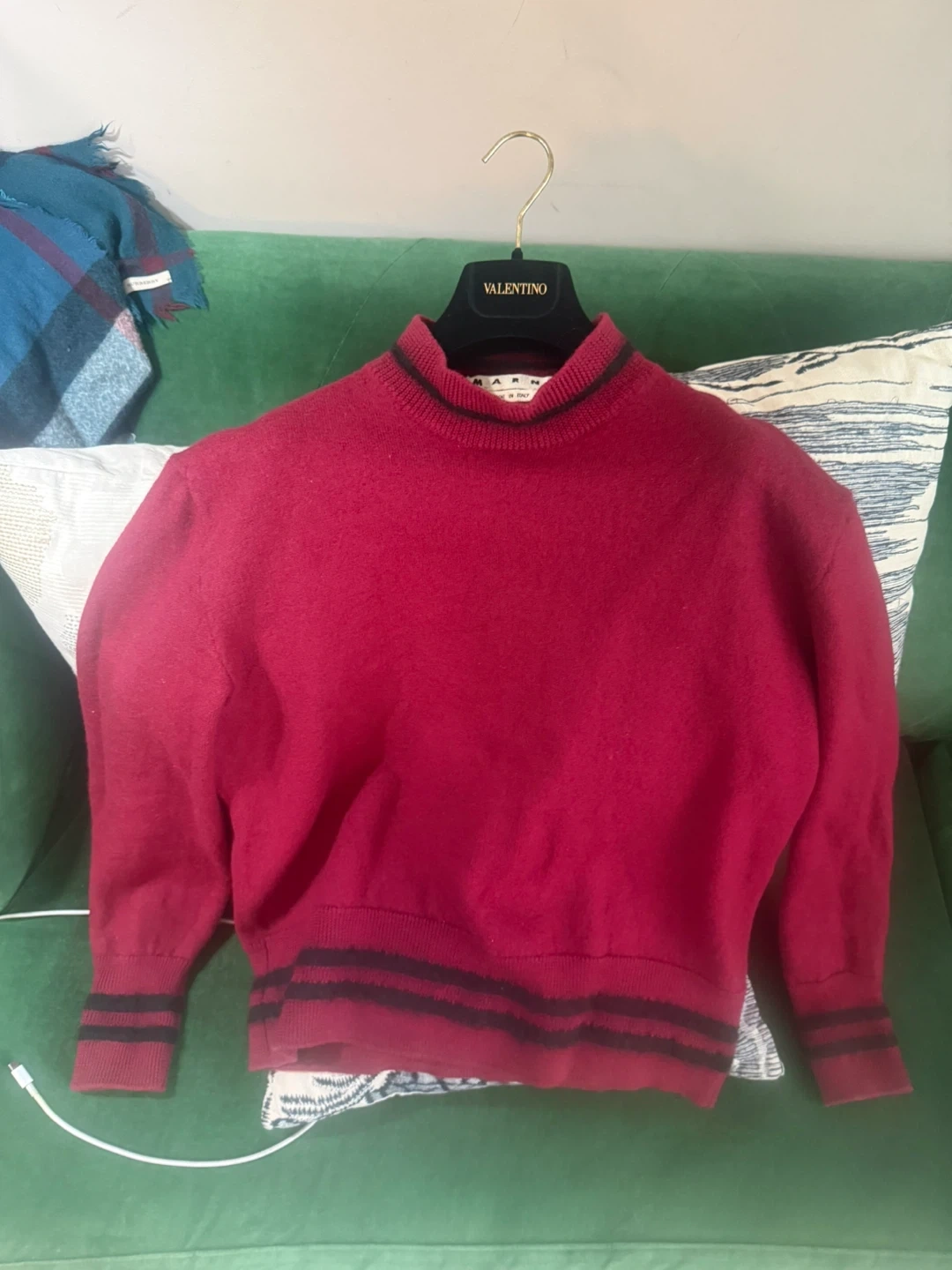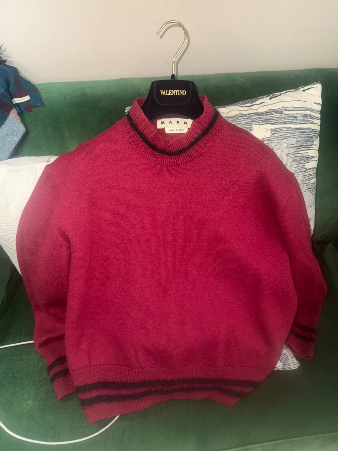 Marni monk neck wool sweater in burgundy color. It’s made with Lana wool and has mohair striped trim on the collar and cuffs. Size IT48 US M. Pick up from queens Elmhurst.