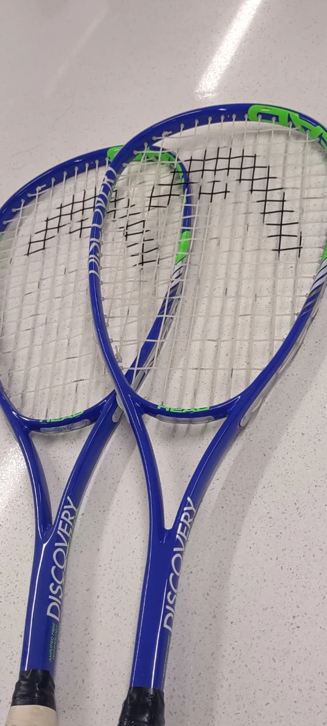 Two blue Discovery tennis racquets are available. They're great for beginner players. The frames are blue with green accents on the head.