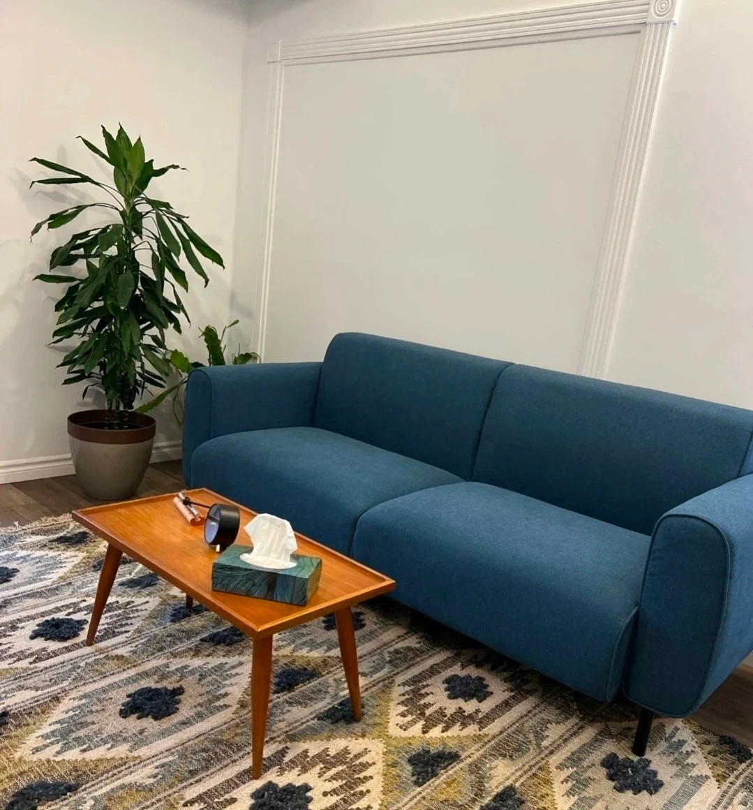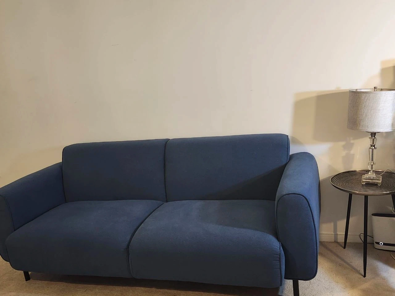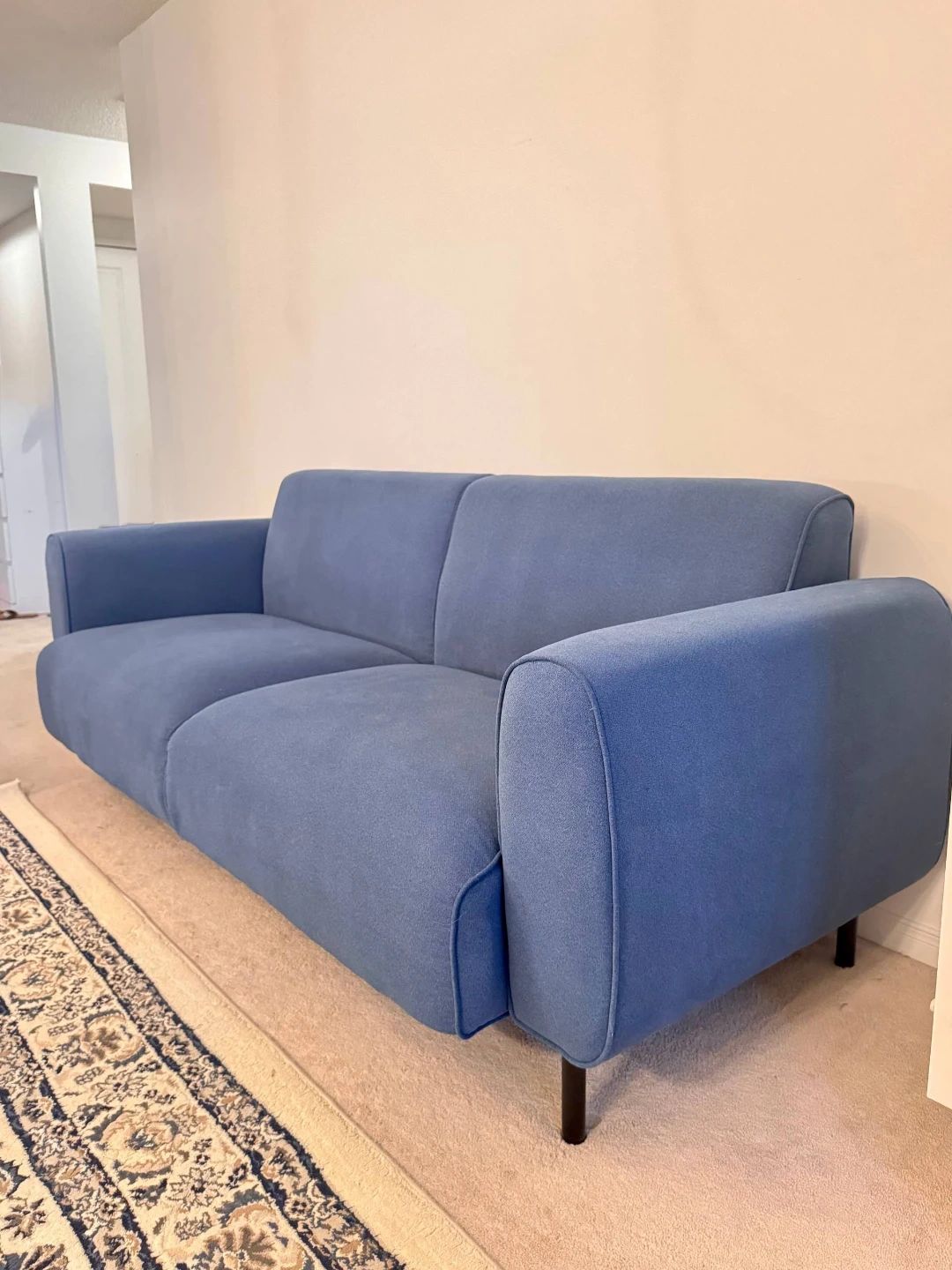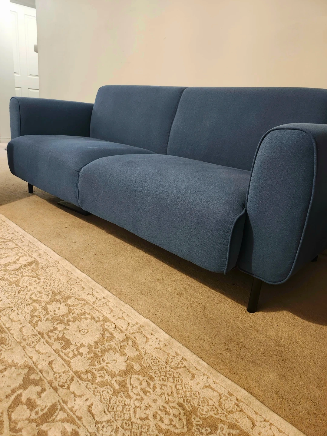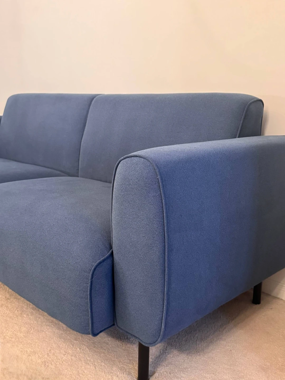 This is a contemporary blue sofa with black metal legs.