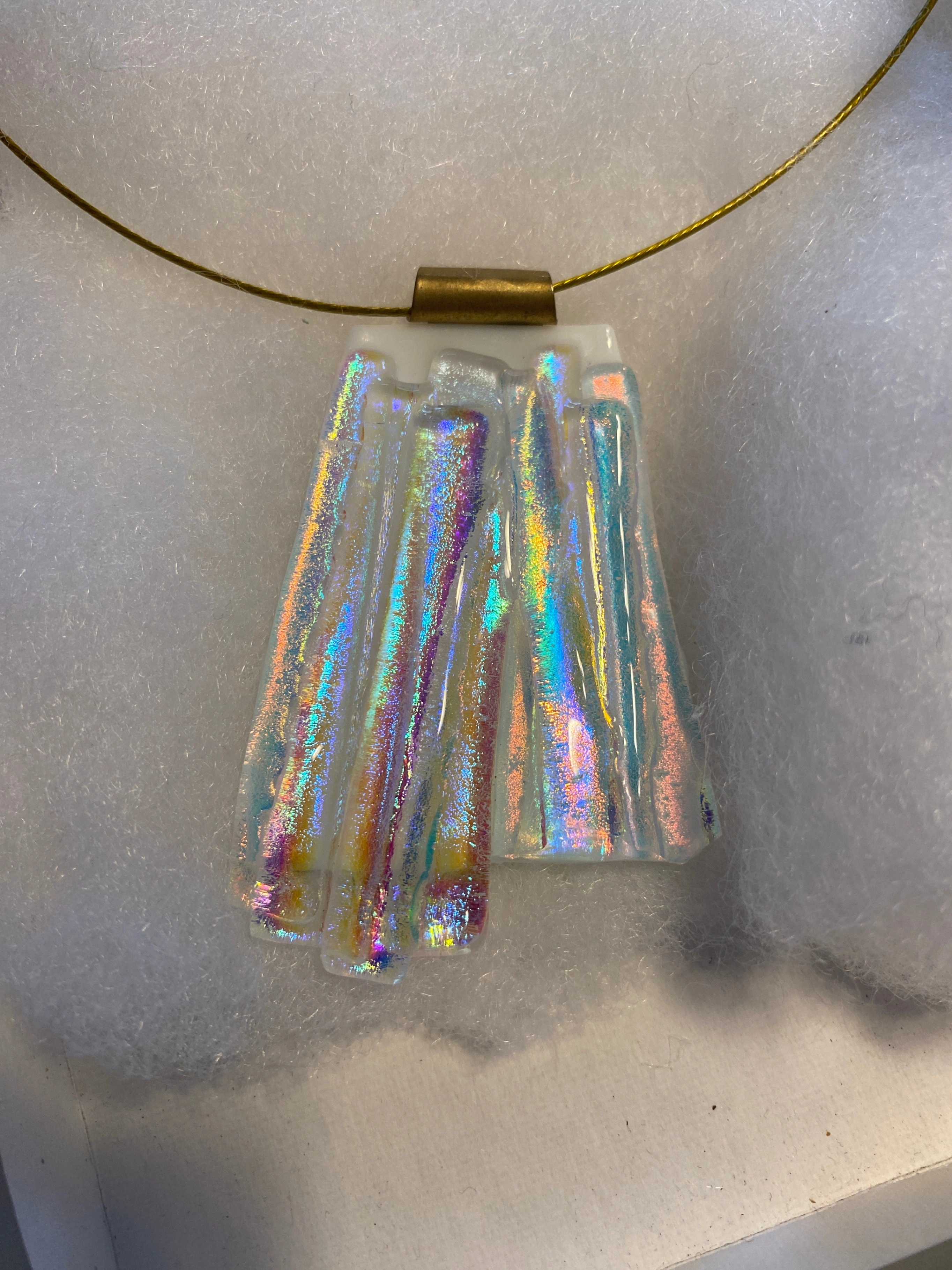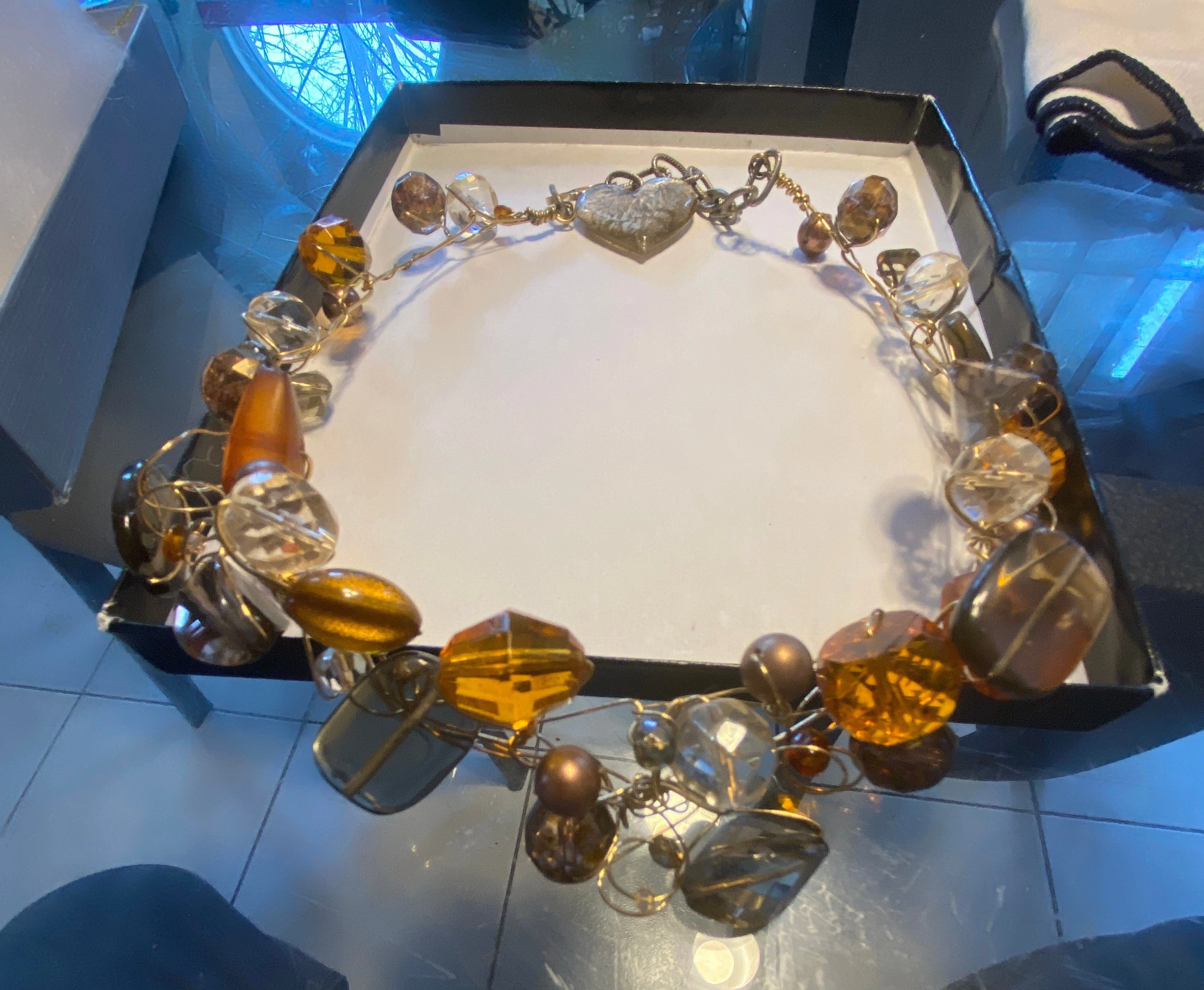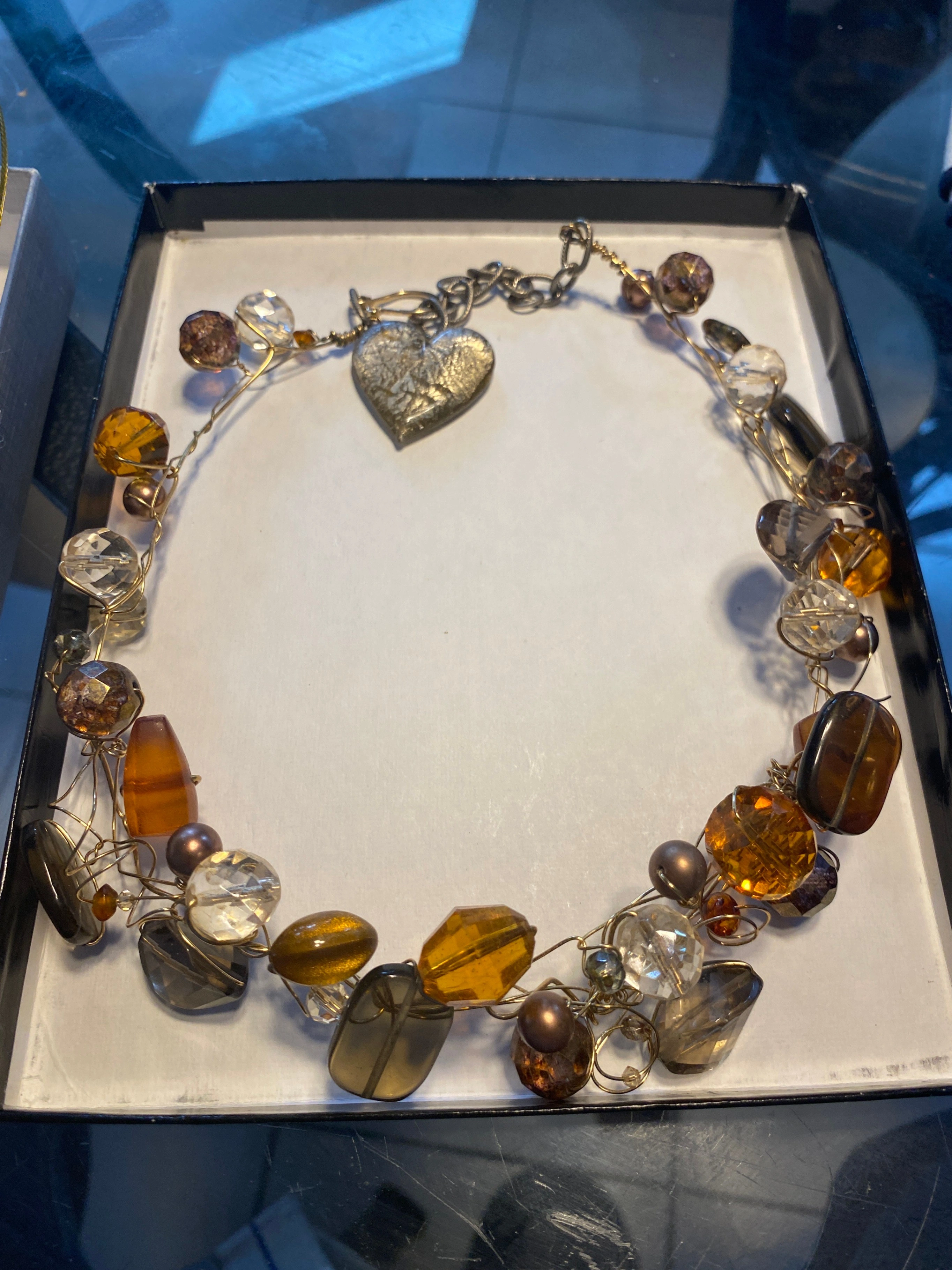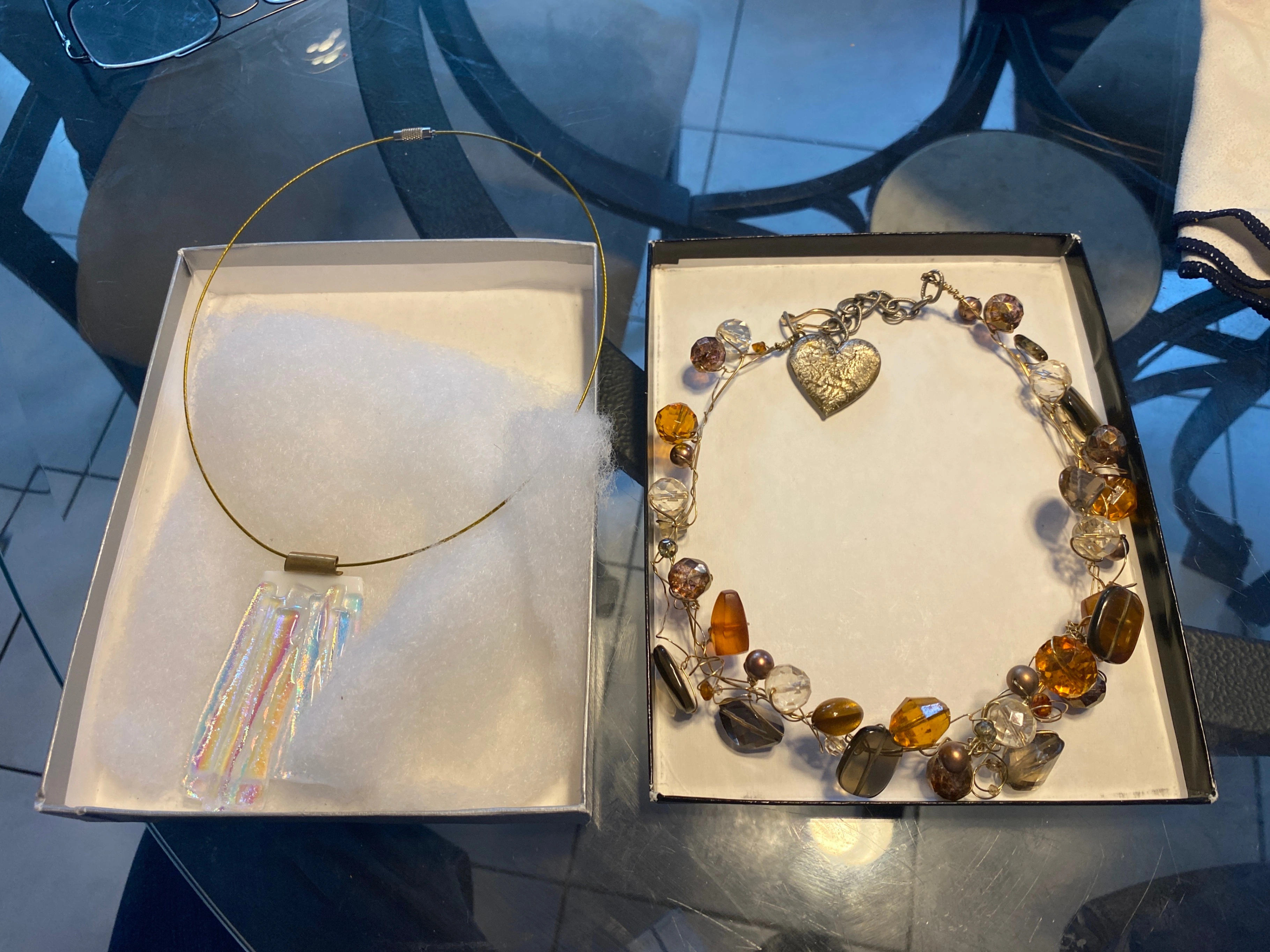 One has a blurred glass look and a solid chain, the second is made up of various coloured stones/jewels.