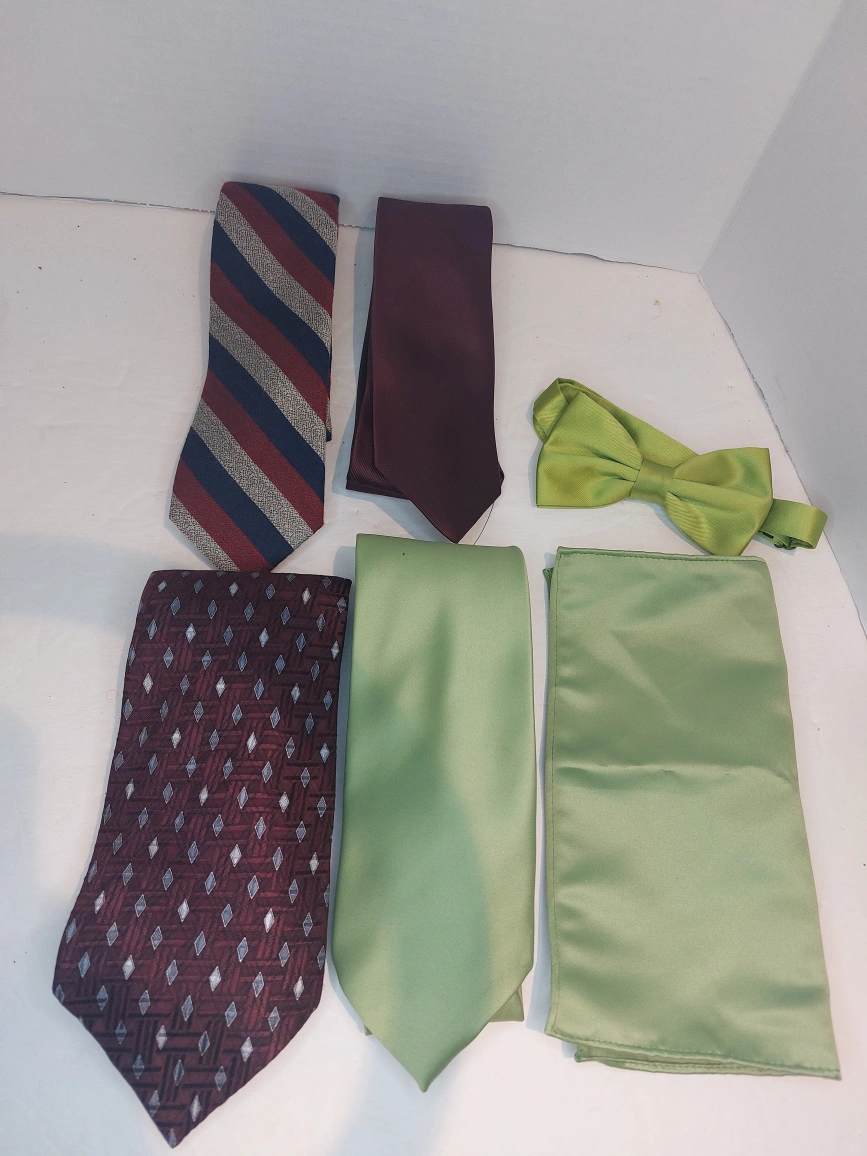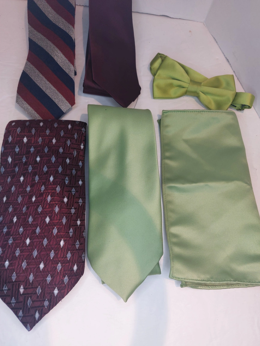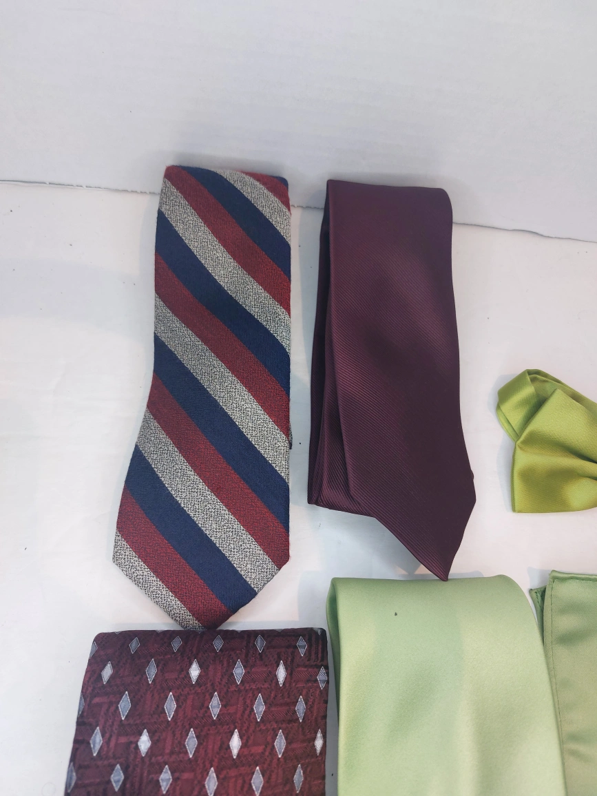 Set includes 4 ties, 1 bow tie and pocket square. All are in like new condition. variety of colours and patterns. Bow tie is solid green.