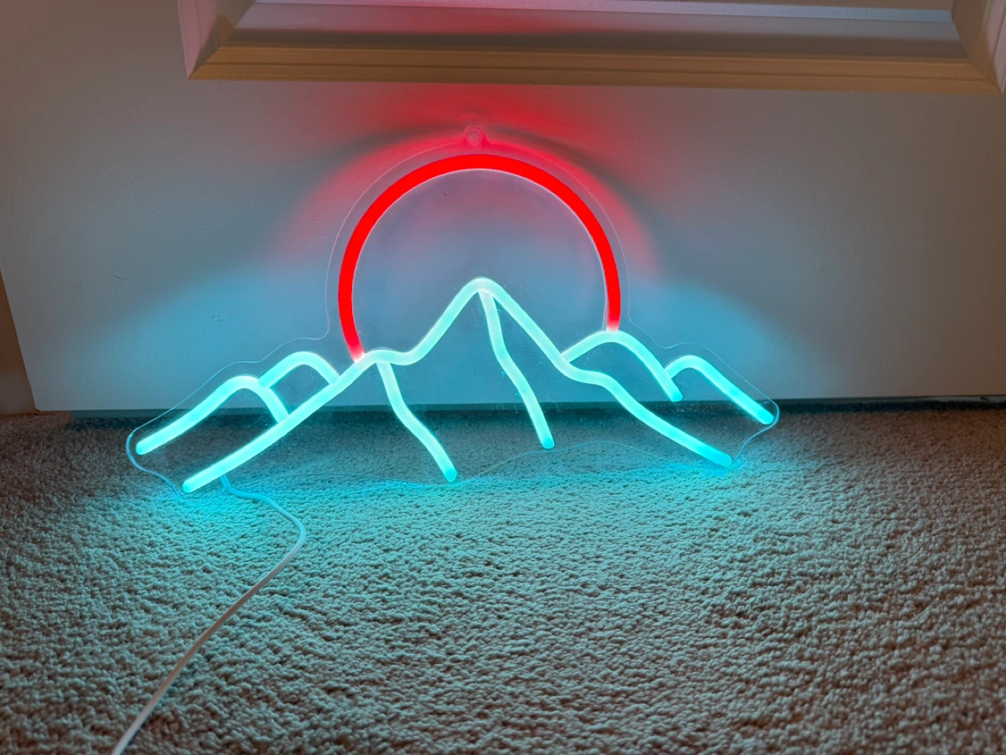 This neon sign features a mountain range with a sunset. It has a dimmer switch for adjustable brightness. Great for a bedroom or living room vibe!