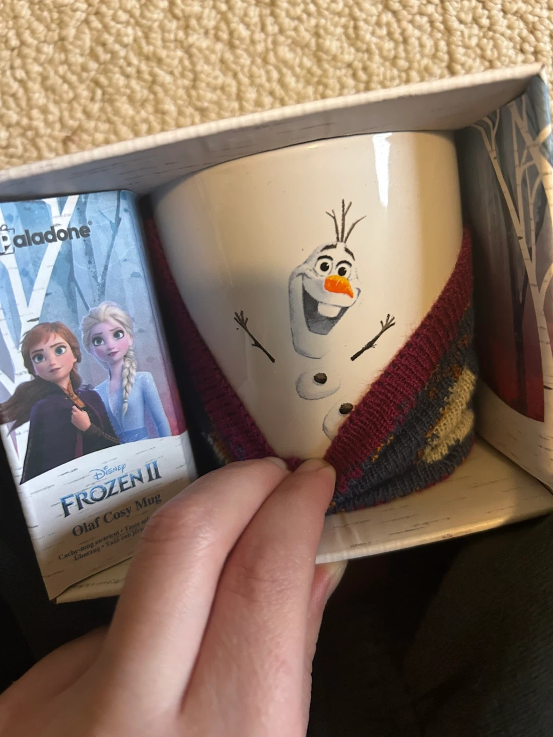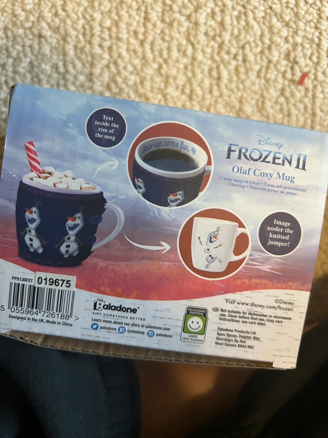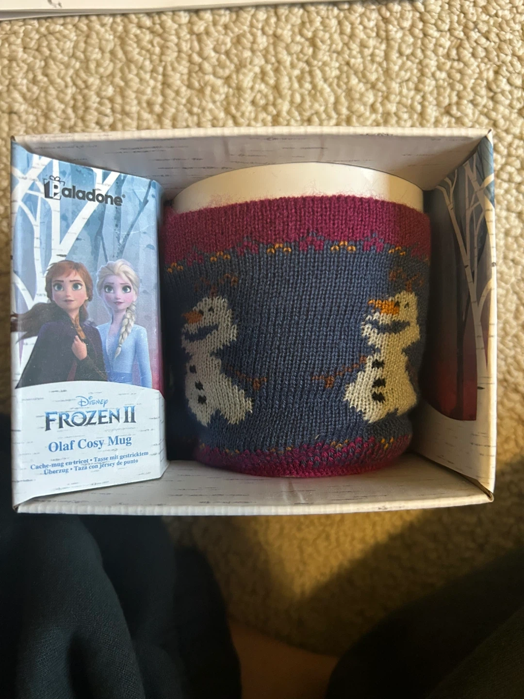 Selling a brand new Disney Frozen II Olaf Cosy Mug! It comes in the original box and features a cute Olaf design with a knitted cosy. Perfect for any Disney Frozen fan!
