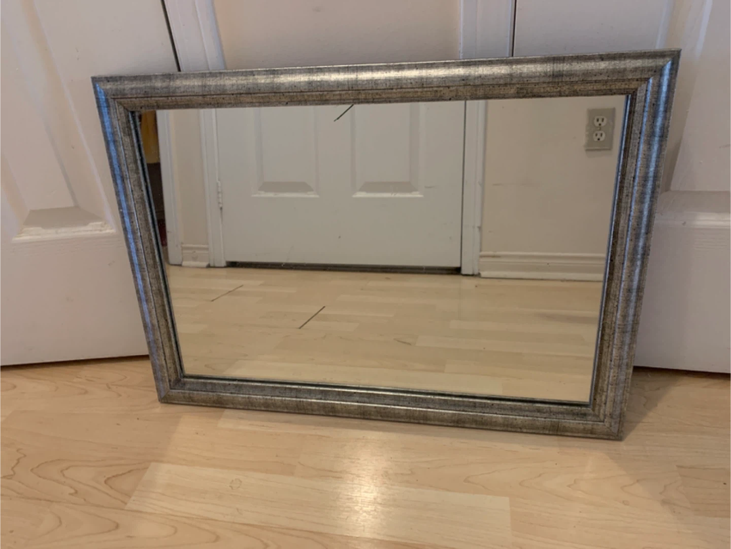 This is a decorative mirror with a silver frame. It's rectangular and has a distressed finish. The mirror's dimensions are not specified.