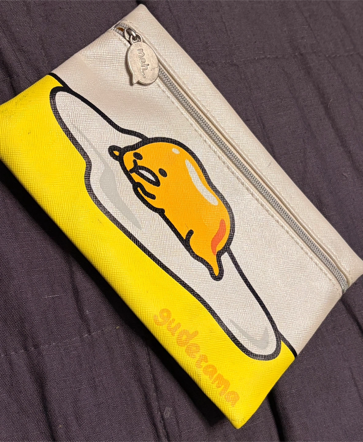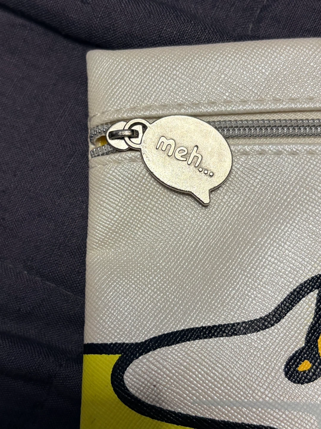This Sanrio Gudetama zippered pouch is perfect for storing small essentials. It features the iconic lazy egg character on a yellow background. The interior lining is bright yellow and it has a "meh..." zipper pull. It's a fun and practical accessory for any Sanrio lover! Pickup on Astoria Blvd South and 38th Street.