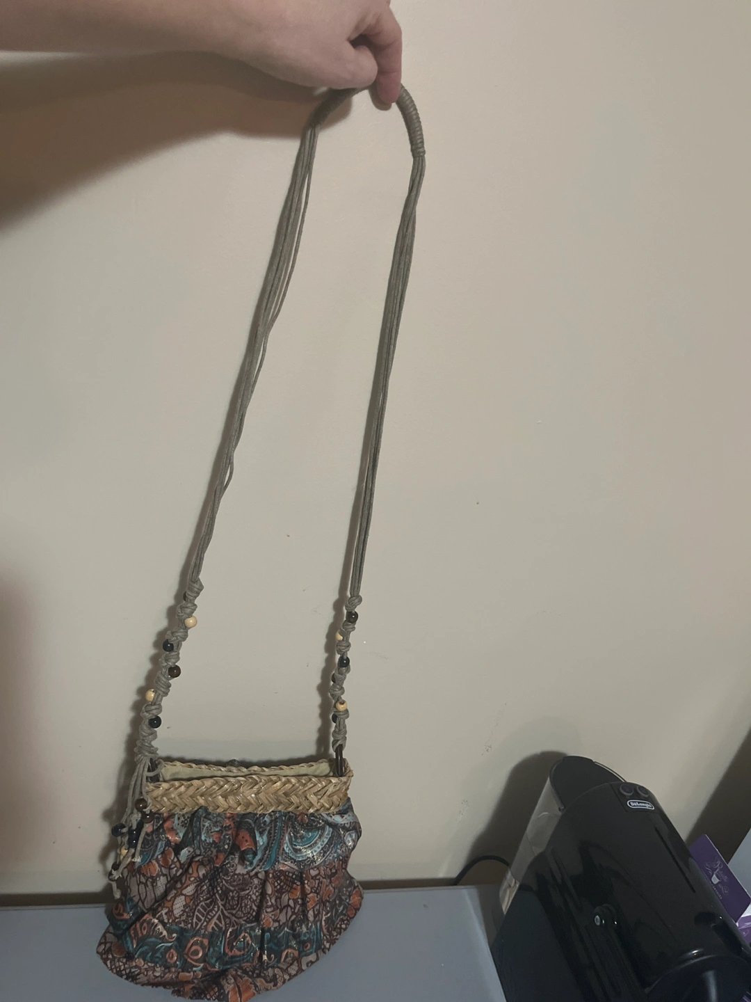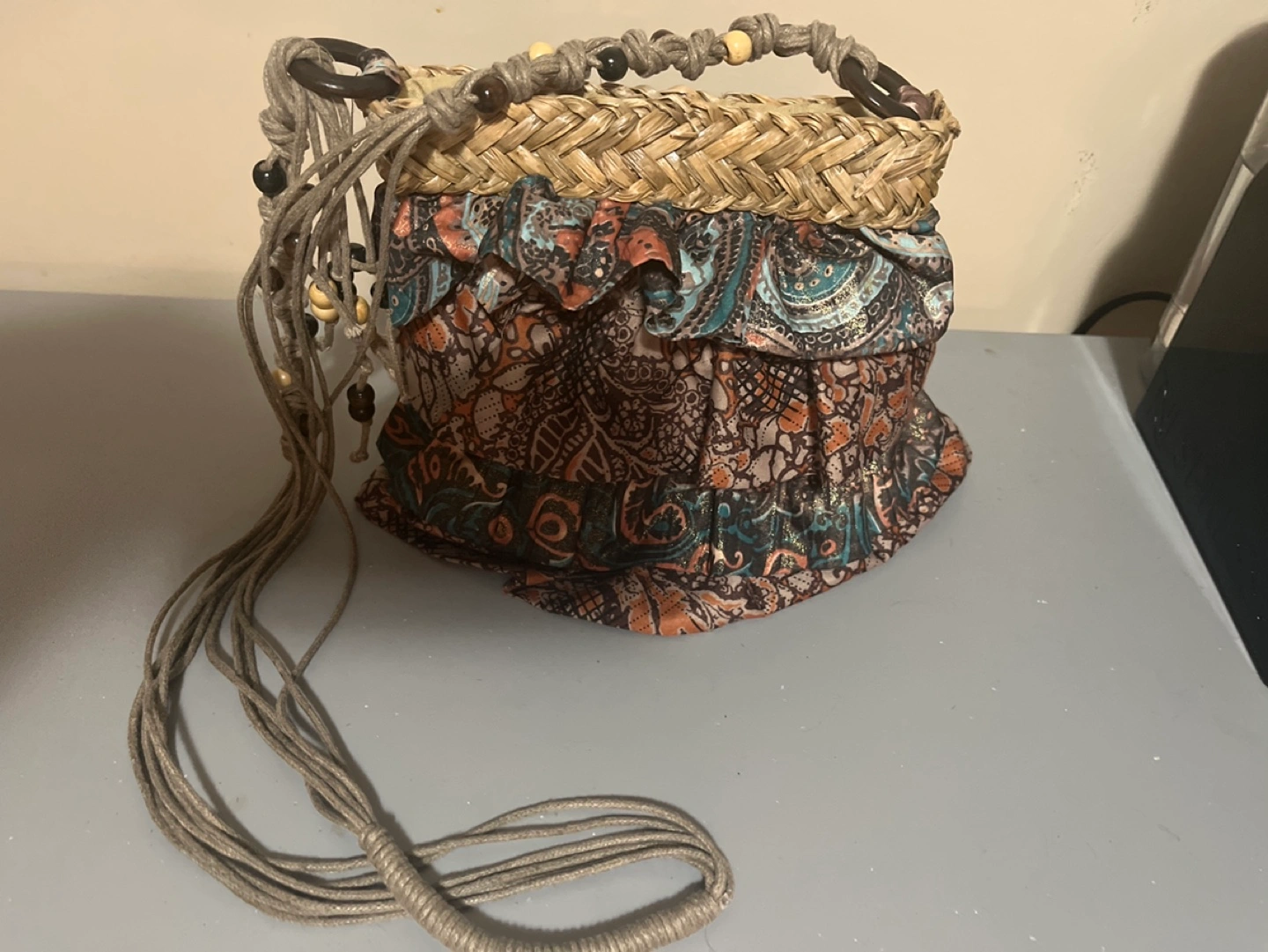 Cute ruffled fabric and macrame beaded shoulder strap purse.