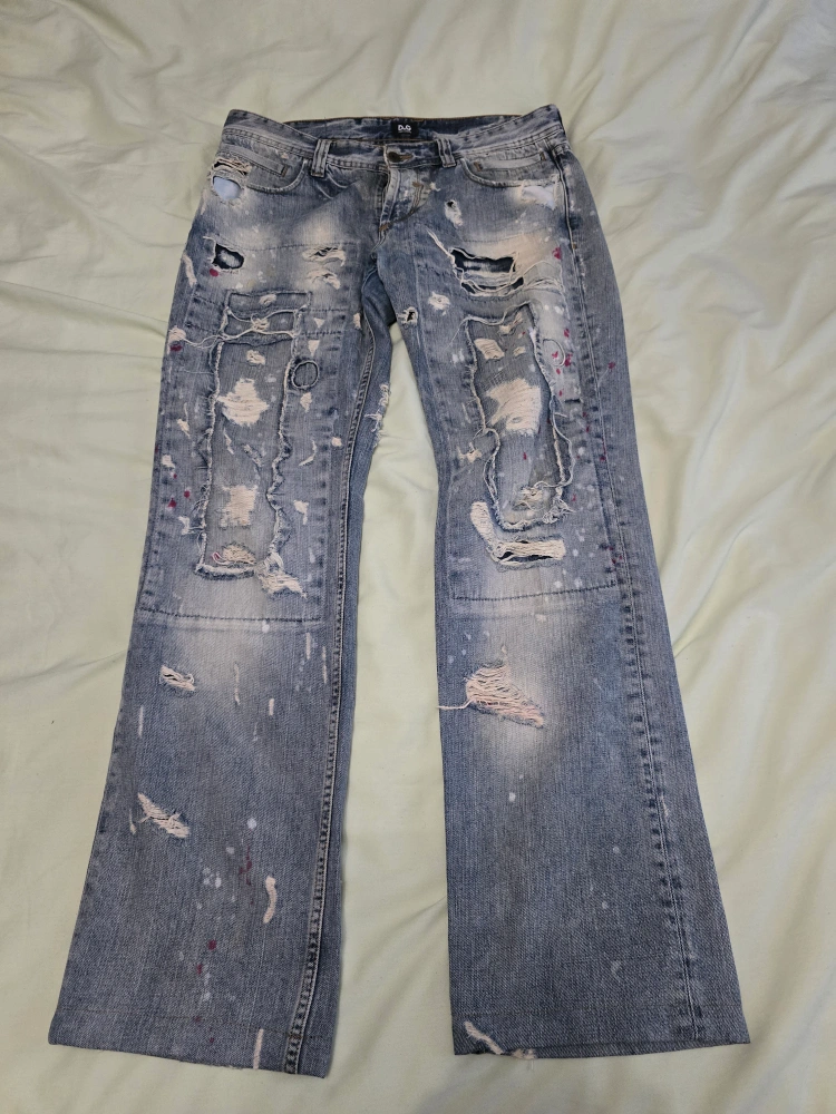 Selling a pair of Dolce & Gabbana distressed denim jeans. They have a unique, worn look with various rips and paint splatters. Please see photos for details, it's an amazing contition.