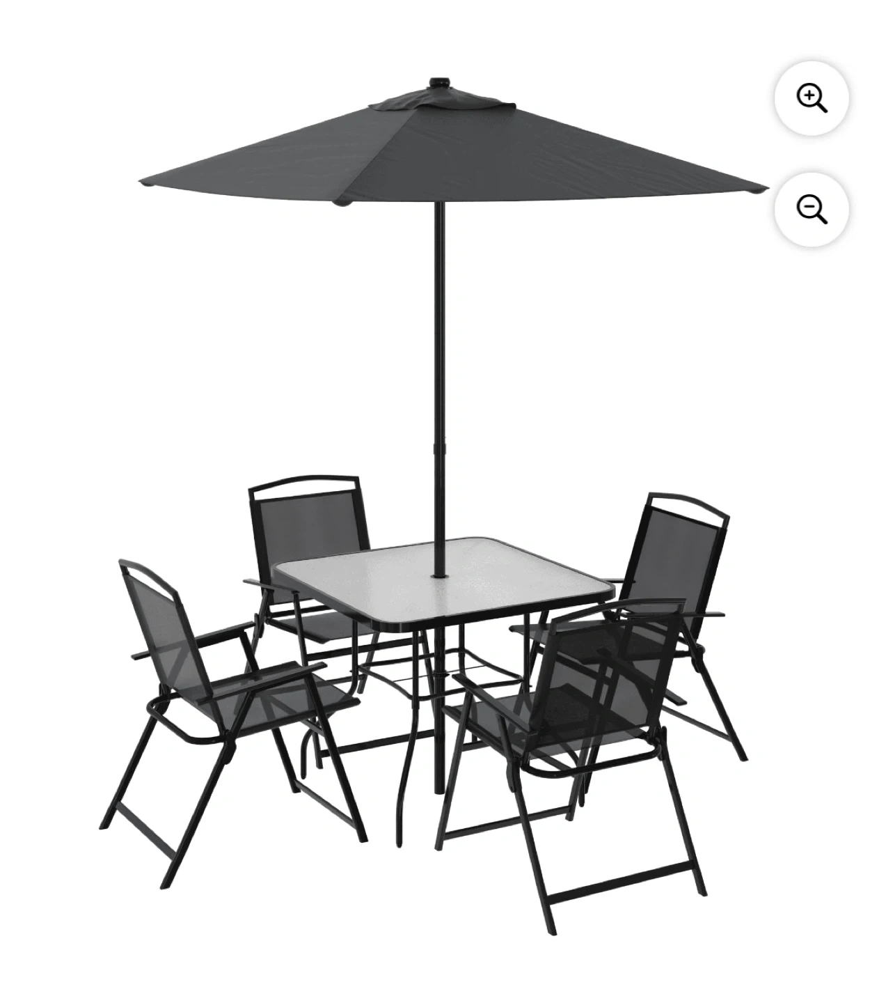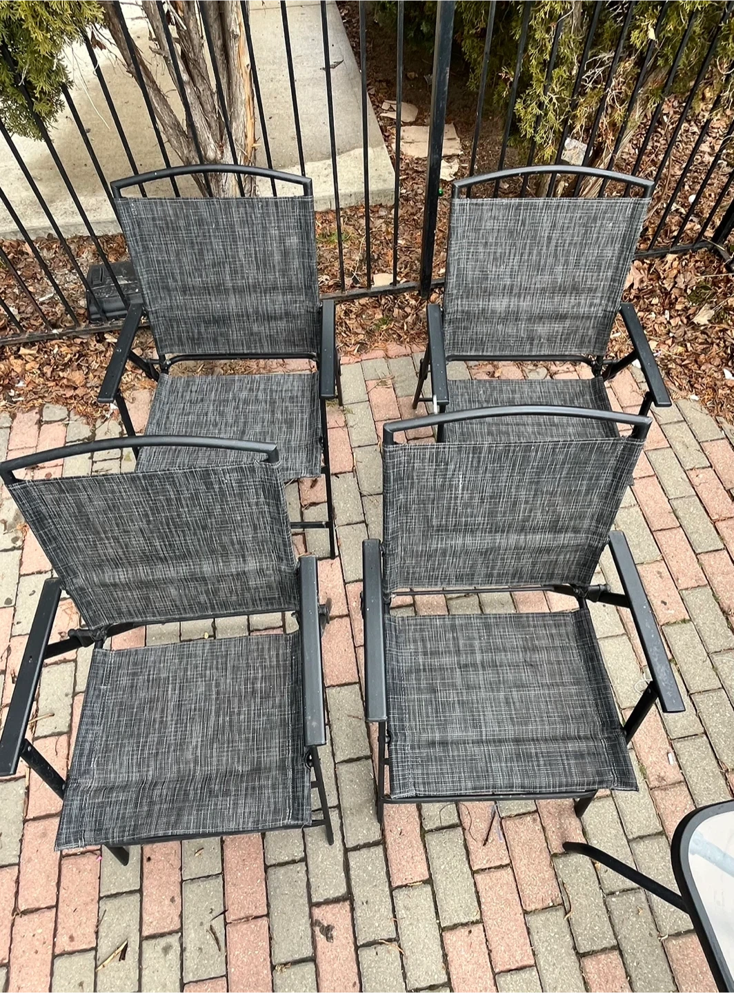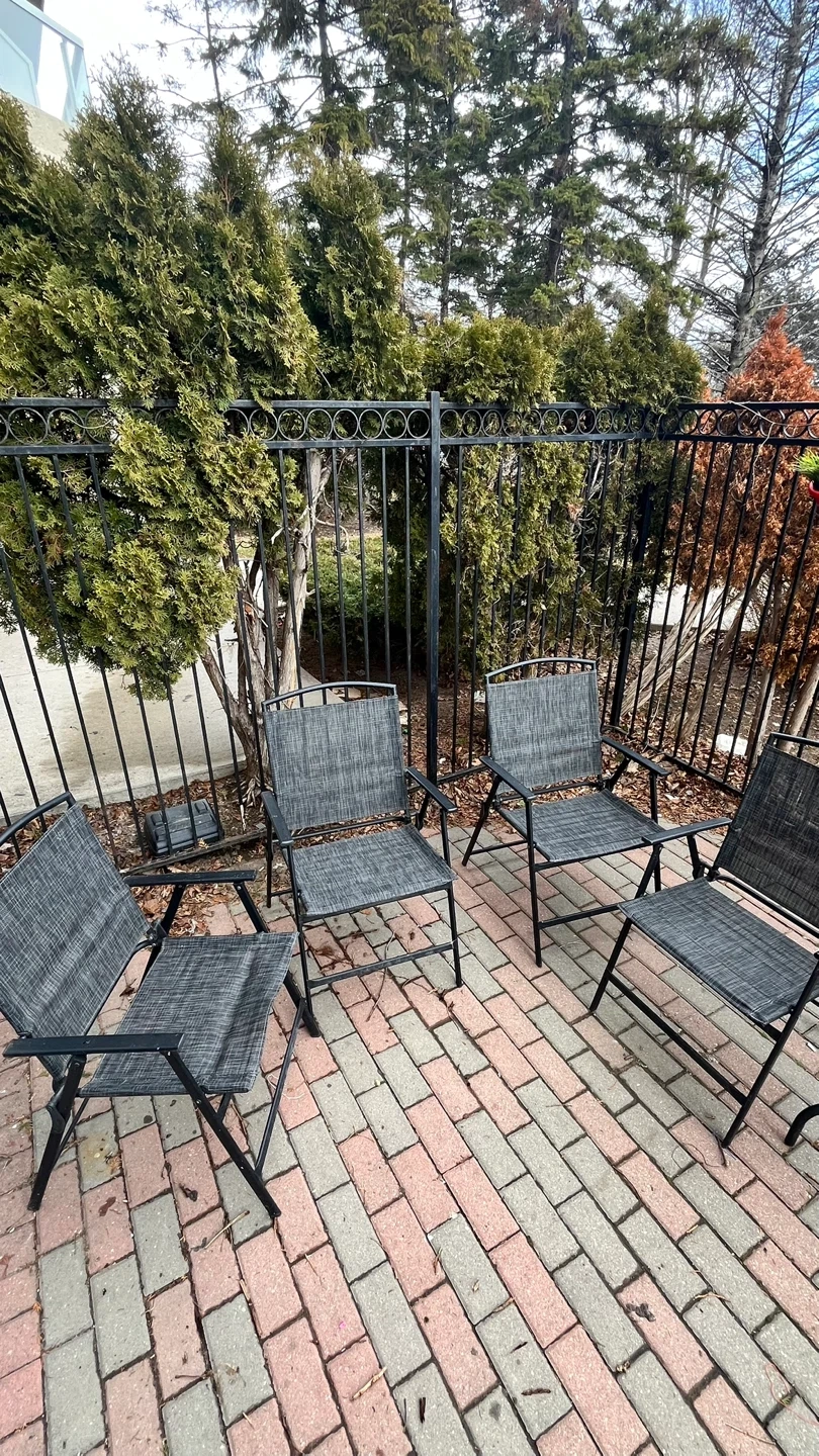 Patio furniture / Outdoor dining set- comes with 4 foldable chairs. Square shaped center table with glass top. Foldable umbrella with cover (picture not available). Table can be dismantled for easy storage and transportation.