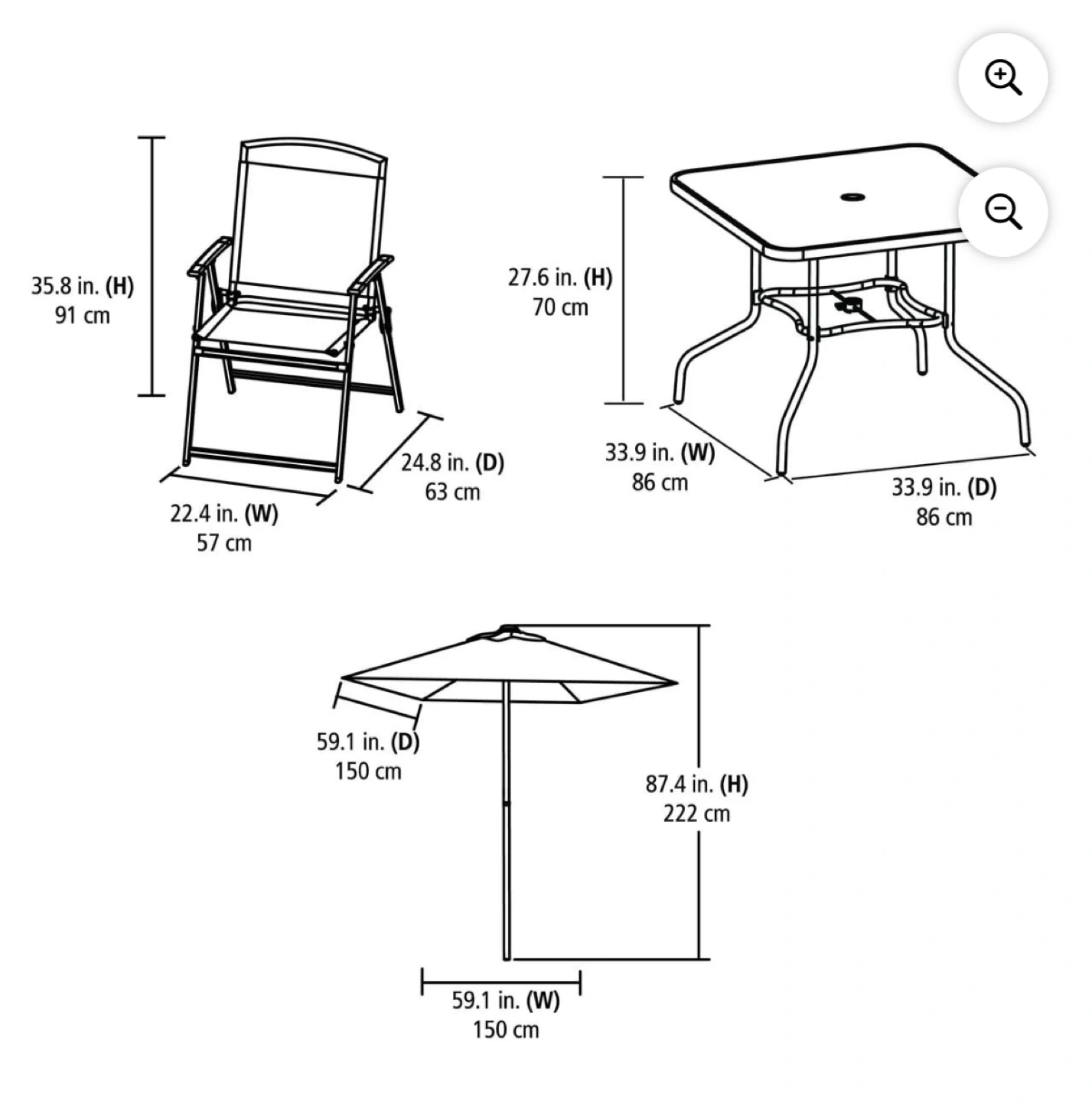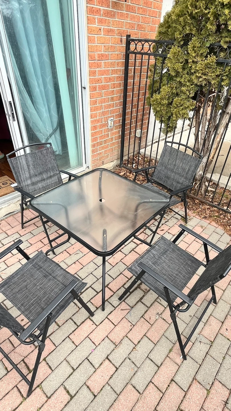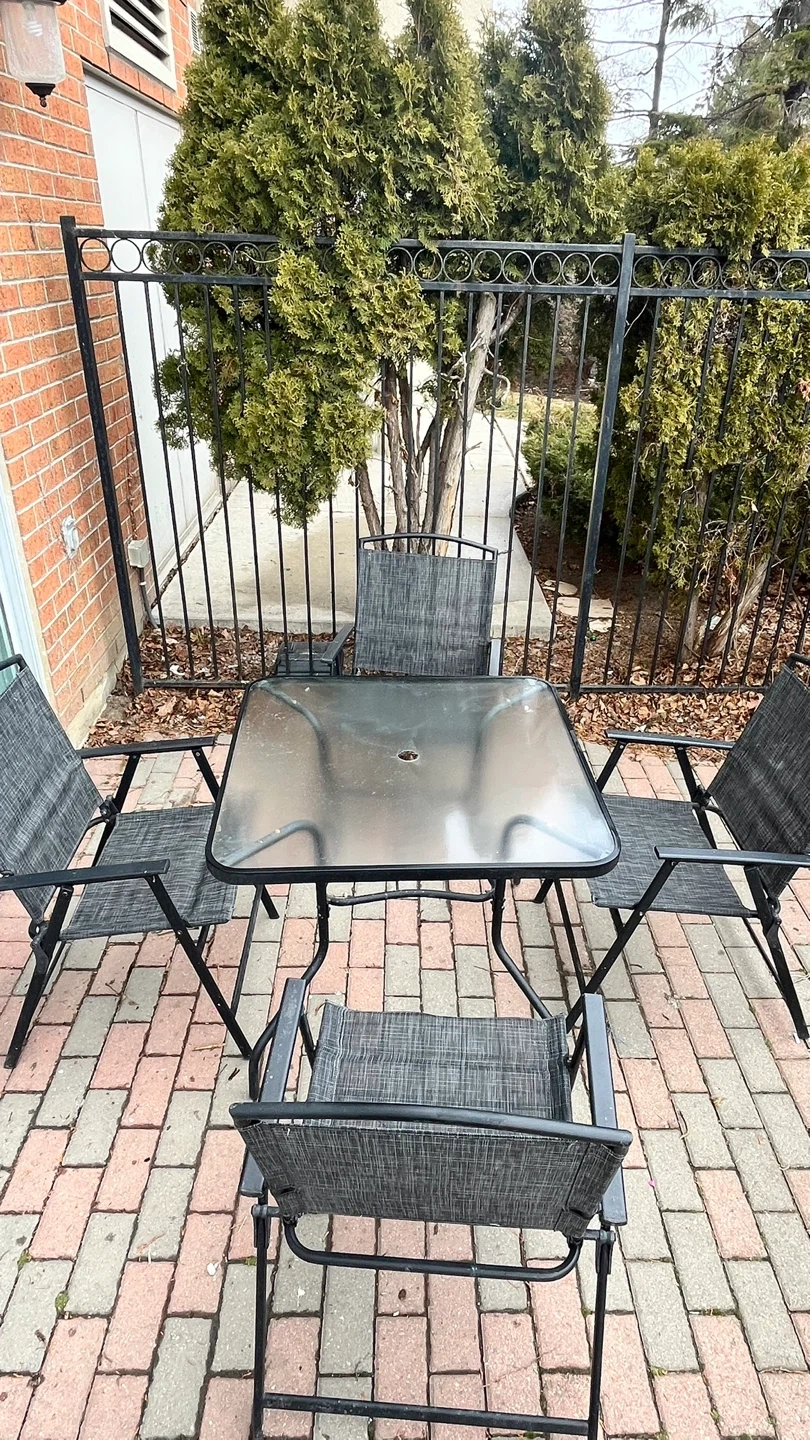 Patio furniture / Outdoor dining set- comes with 4 foldable chairs. Square shaped center table with glass top. Foldable umbrella with cover (picture not available). Table can be dismantled for easy storage and transportation.