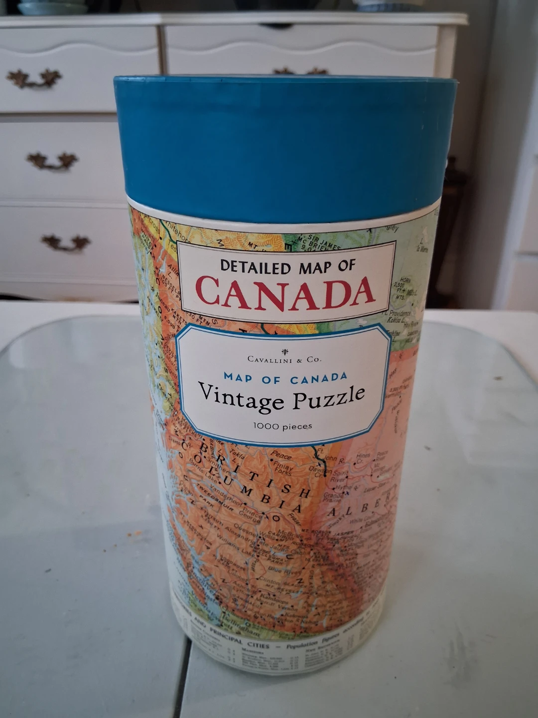 Selling a Cavallini & Co. Vintage Puzzle, featuring a detailed map of Canada. It's a 1000-piece puzzle and comes in its original packaging.