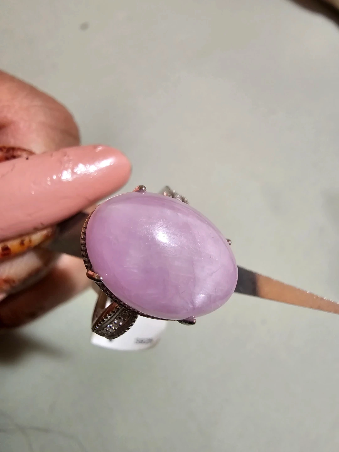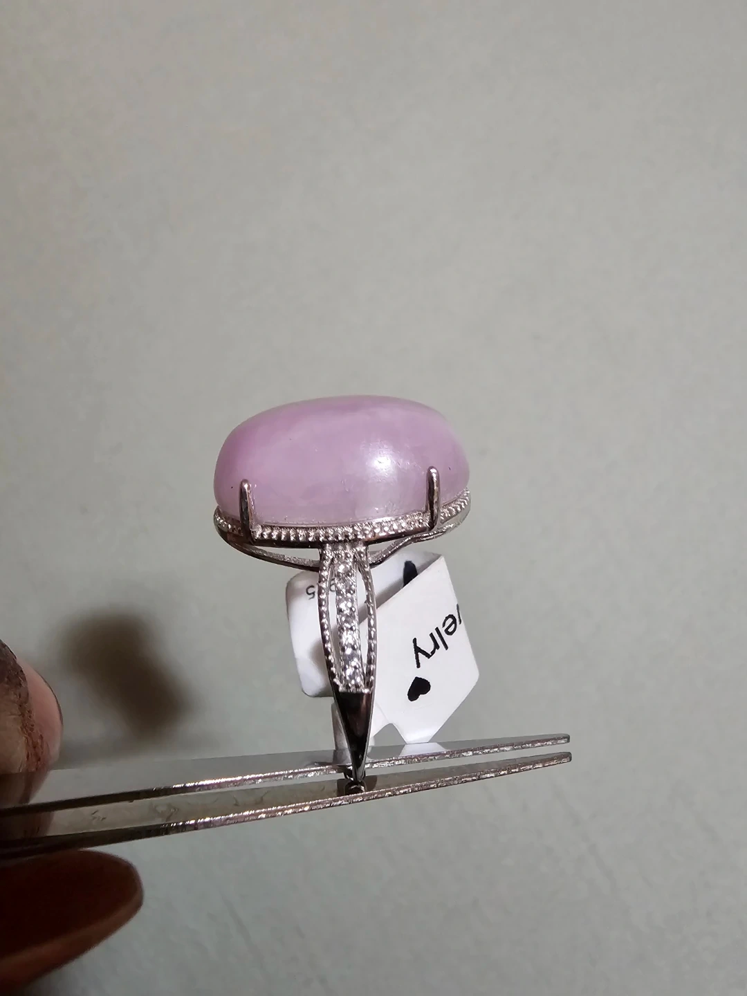 This beautiful ring features a large, smooth pink purple kunzite gemstone set in a sterling silver S925 band. It's accented with small, clear stones around the main gem. The band has a lovely textured detail. It's a real eye-catcher! -Spiritual: Opens the heart chakra connects mind and heart promotes divine love, kindness, and self-worth.