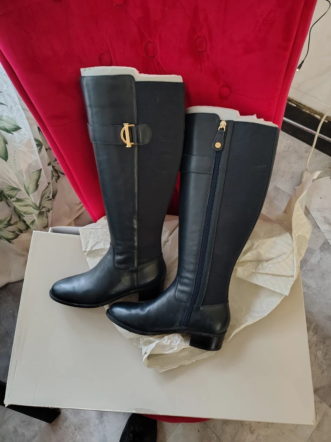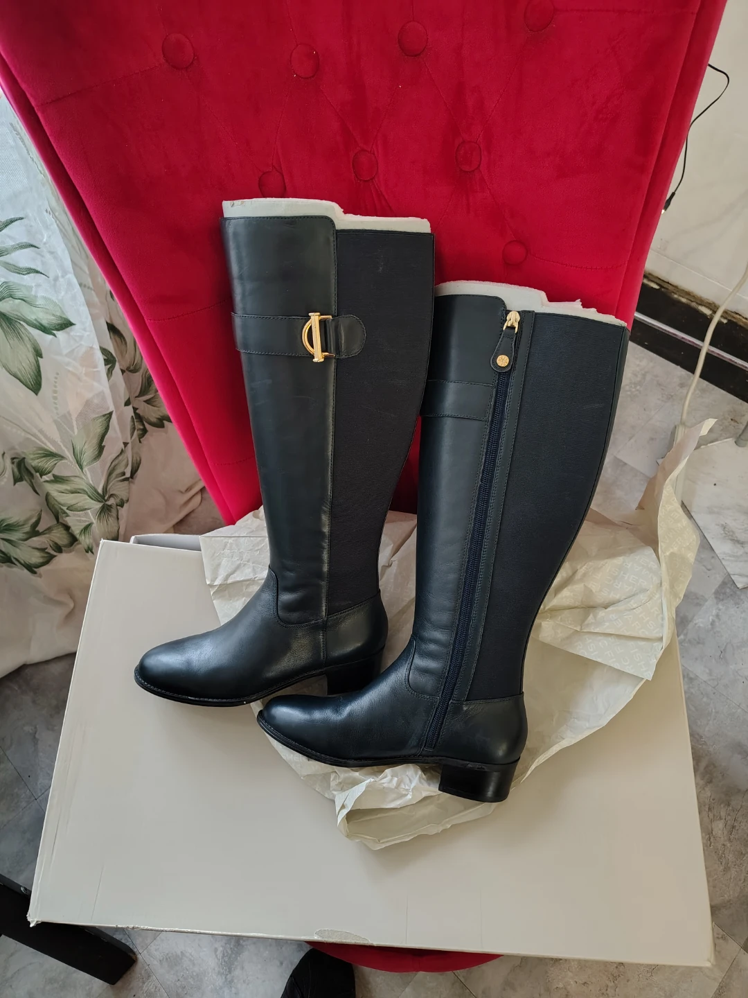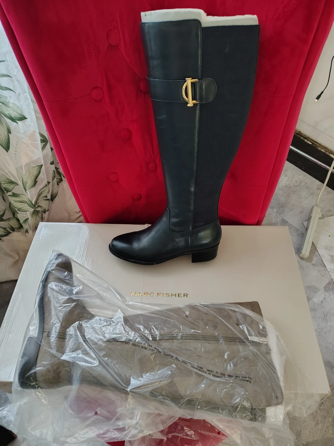 Marc Fisher women's knee-high boots. Black leather with gold-tone hardware and side zippers. Includes original box.