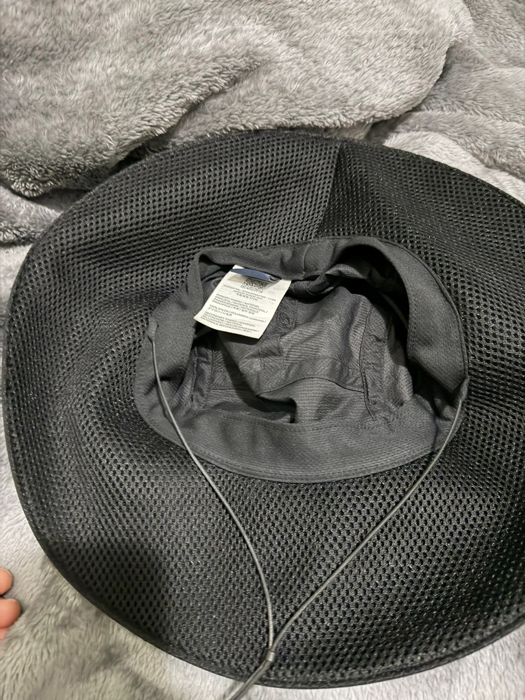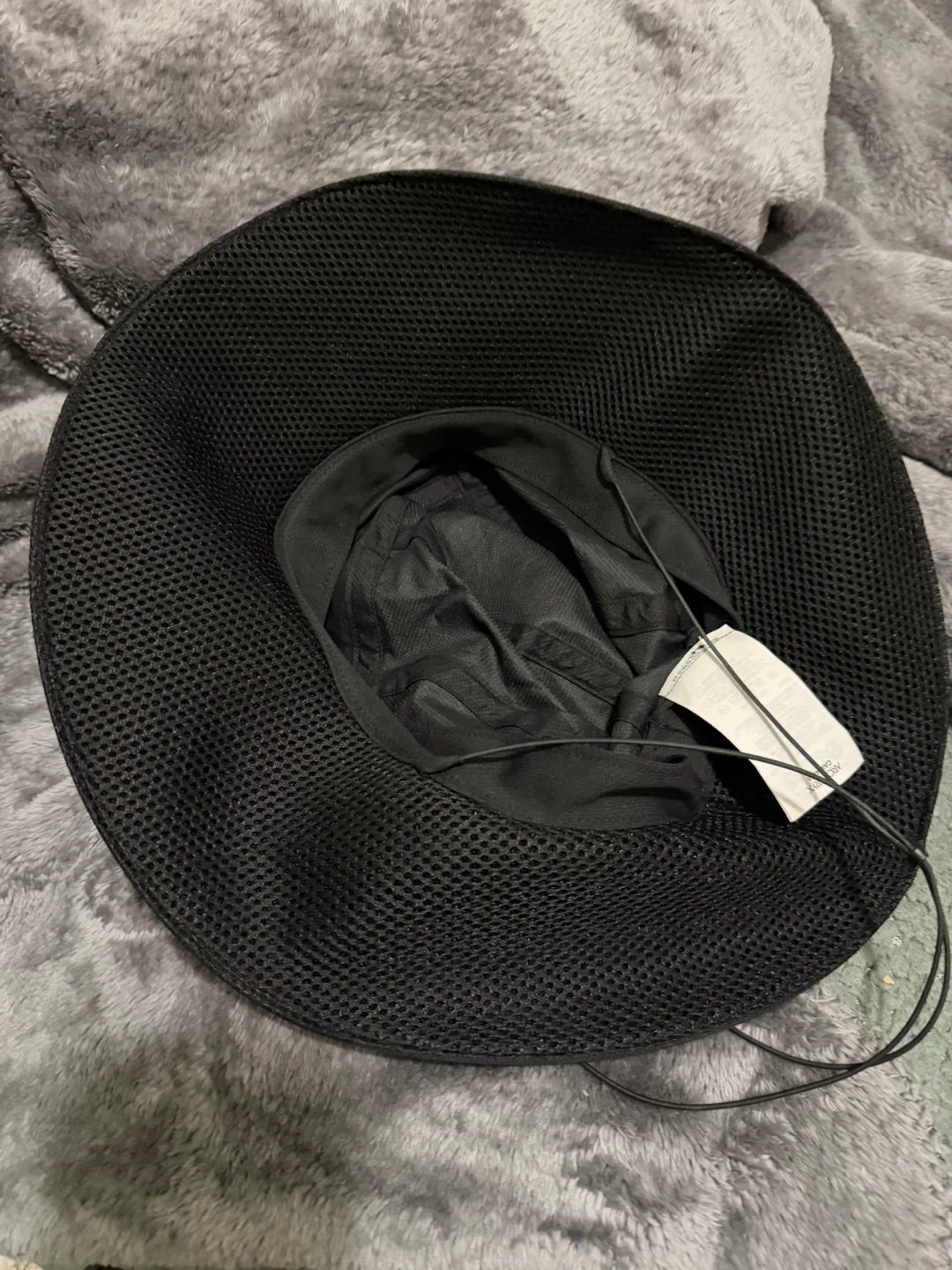 Arc'teryx bucket hat in black. Breathable mesh construction for ventilation. Features a chin strap for secure fit. Great for outdoor activities.