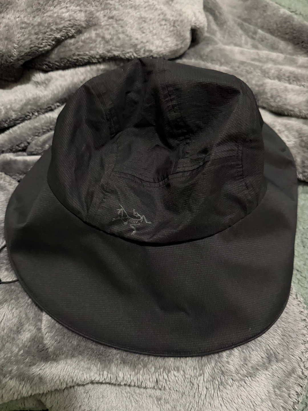 Arc'teryx bucket hat in black. Breathable mesh construction for ventilation. Features a chin strap for secure fit. Great for outdoor activities.