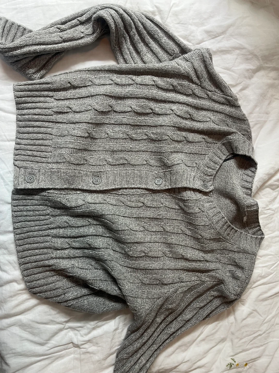 Selling a cozy grey cable knit cardigan. It's in great condition and perfect for layering on chilly days!