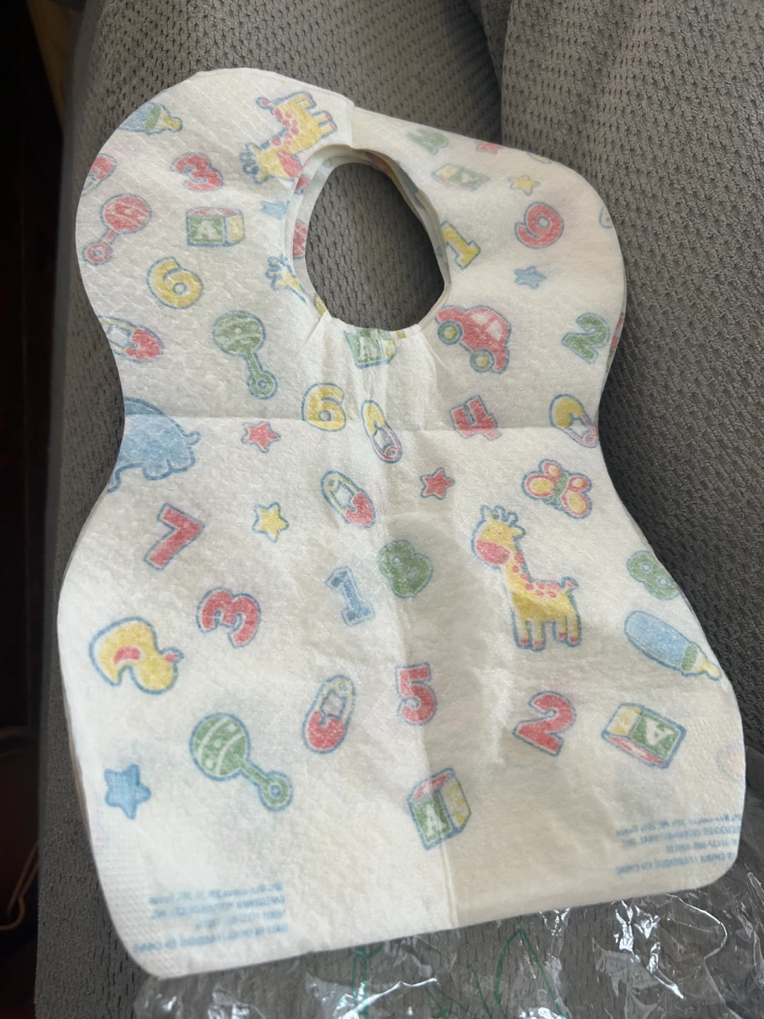 Pack of disposable baby bibs with a cute print of animals and numbers. Convenient for mealtime messes! Great for on-the-go use.